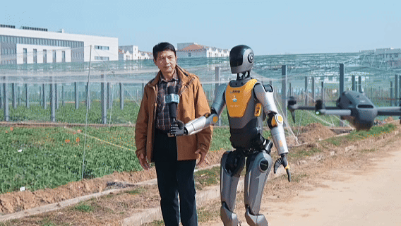 此时,机器人的伴飞无人机升空,从空中捕捉这一场景。这种“机器人+无人机”的配置,使得报道不再局限于平视角度,将为观众提供了沉浸式的全景观察体验。