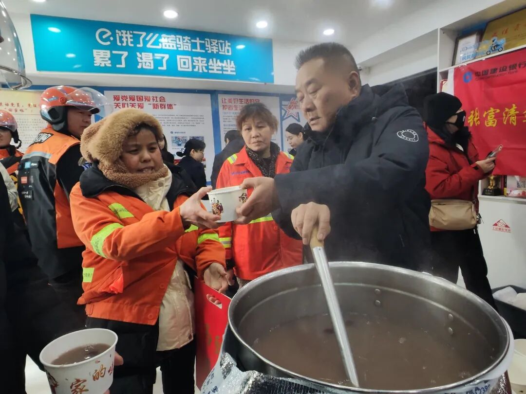 活动一开始,驿站里就热闹起来,外卖骑手、快递员、环卫工人陆续赶来,社区工作人员和志愿者们赶紧把热乎的腊八粥、排骨藕汤递到大家手上,再送上准备好的新春对联。一句句节日祝福说出来,驿站里瞬间暖意融融,年味十足。看着大家捧着热粥,脸上笑开了花,一位骑手说“社区记着我们,心里特别暖”,我心里也跟着暖乎乎的,我们做的事能让大家感受到被惦记,值了!