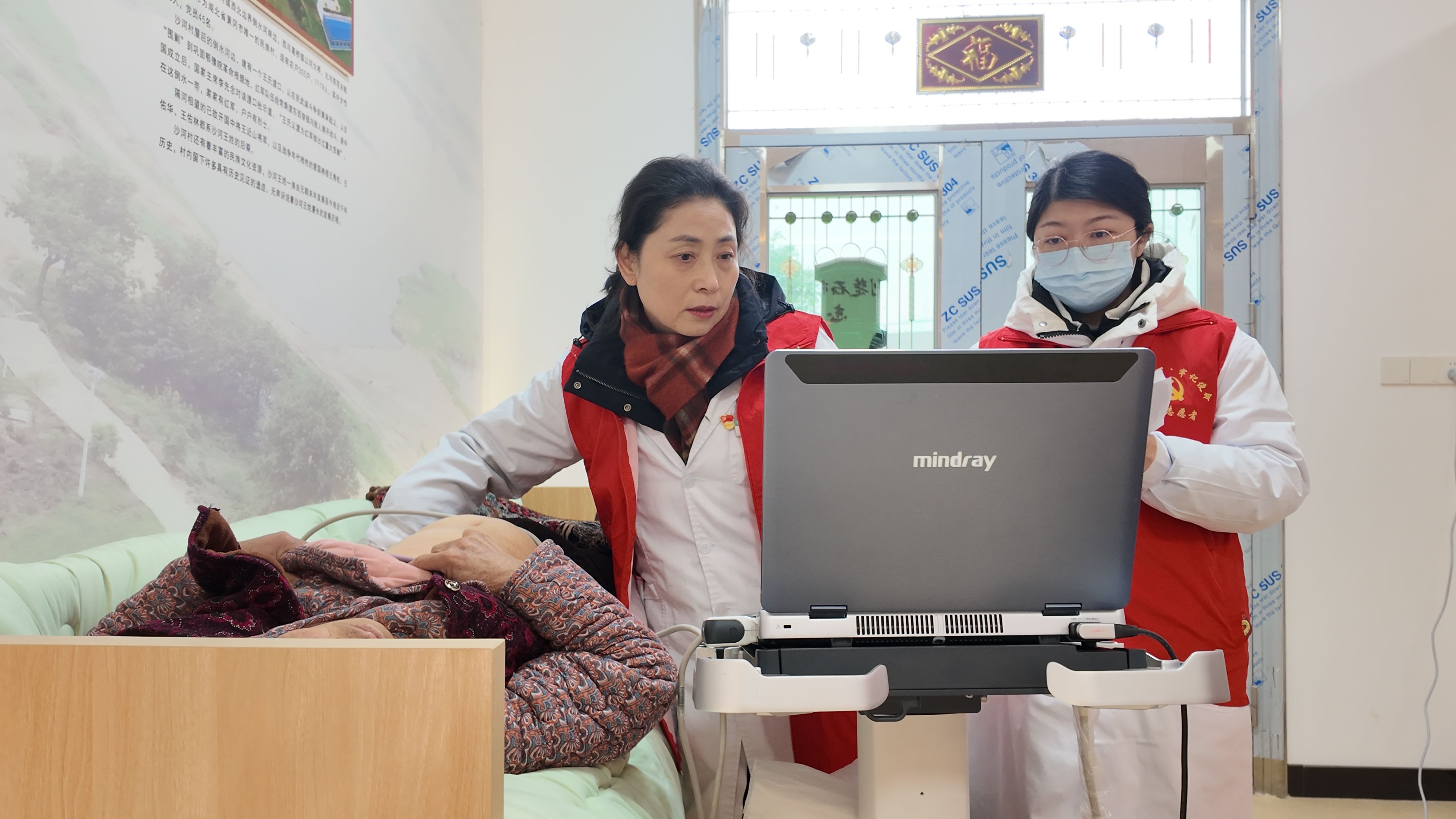 武汉科技大学附属老年病医院超声医学科主任陈芳和主管技师黄娜进行B超检查。