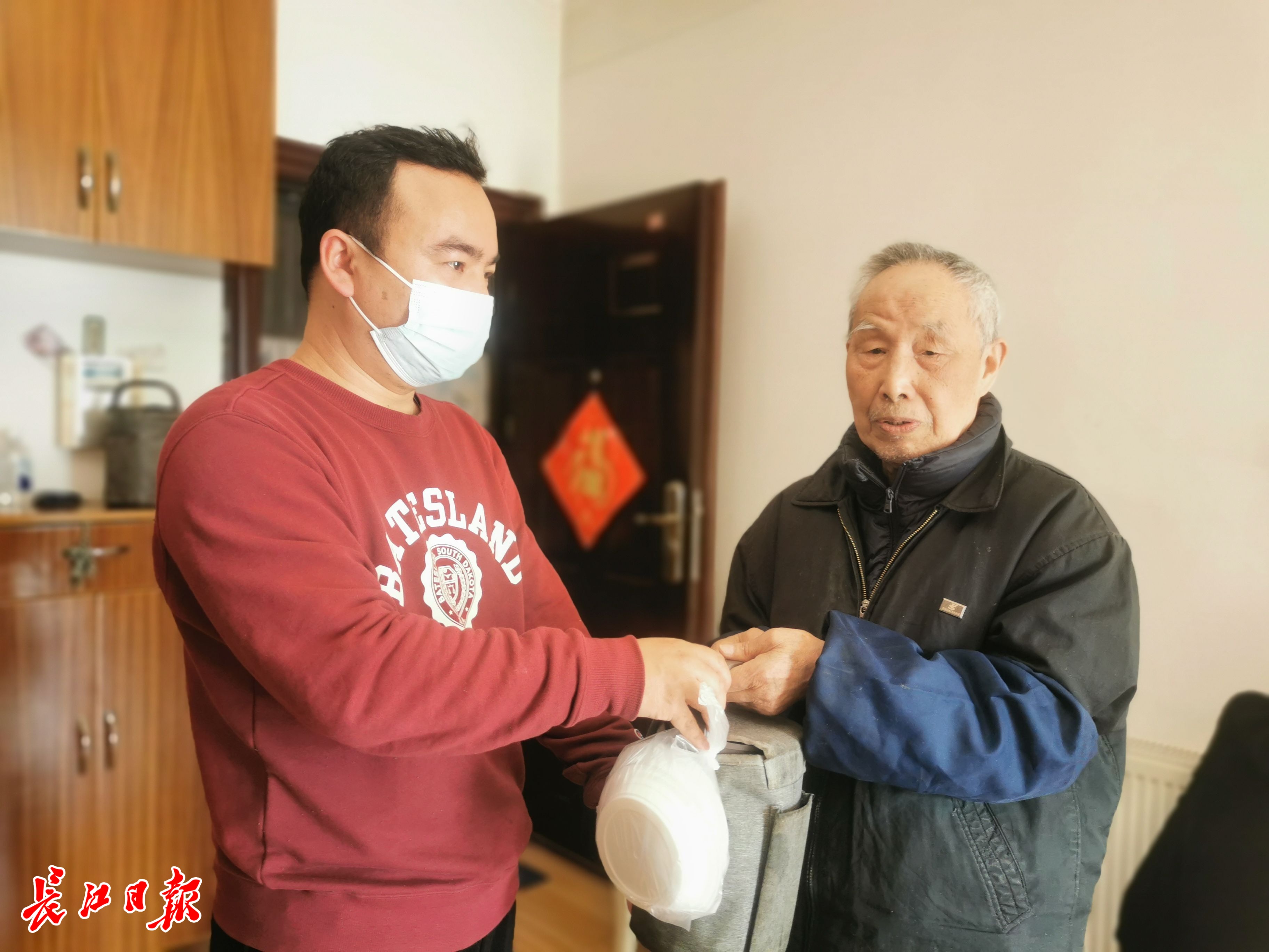 韩志巍送完餐匆匆离去,“人手紧张,还有十几家等人送。”他是一名退役军人,因为责任心强被安排负责送餐,现在他常常挤出时间,提着餐盒一路小跑。电梯检修时,韩志巍一层层爬上9楼,满头大汗的模样让陈家老两口心疼不已。