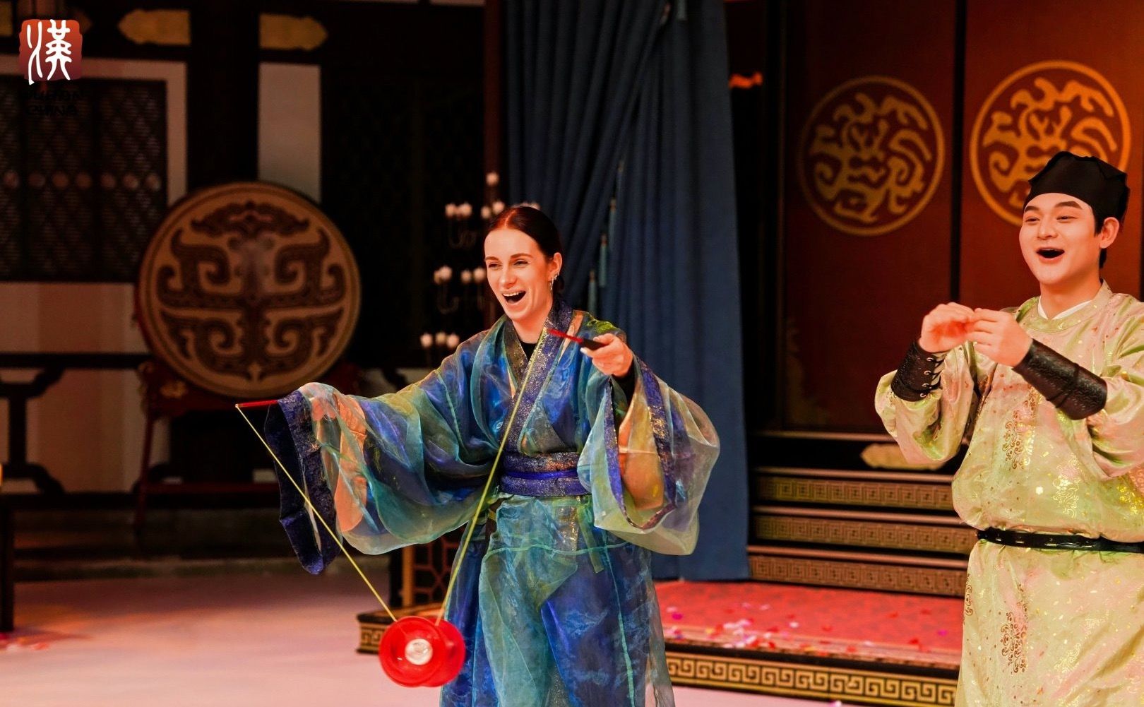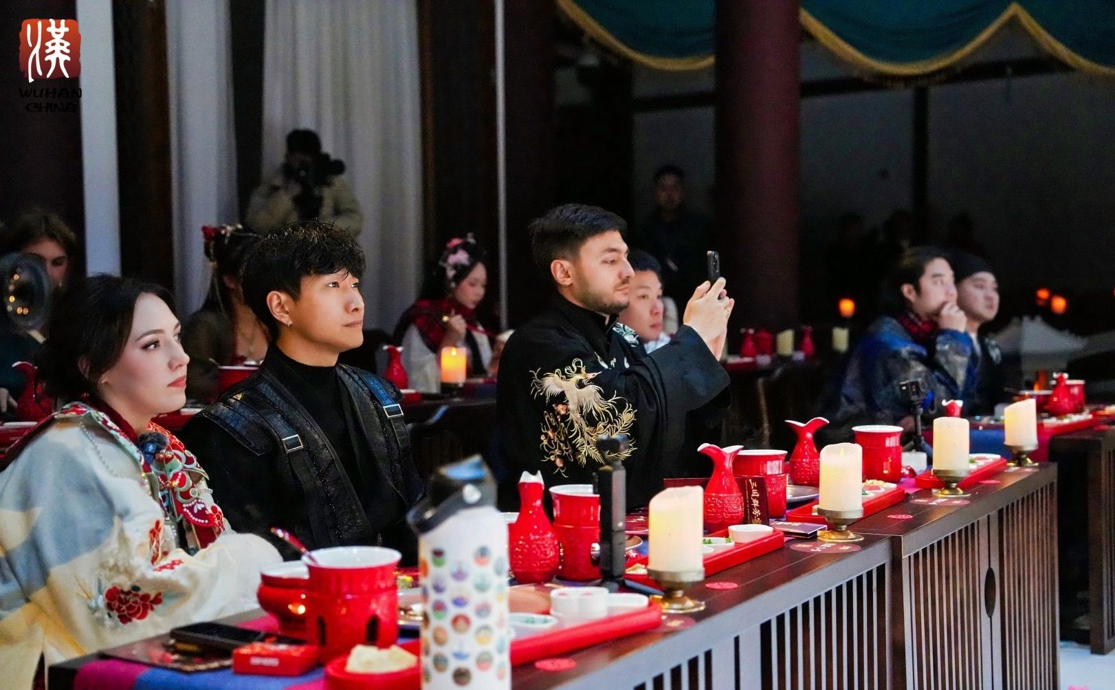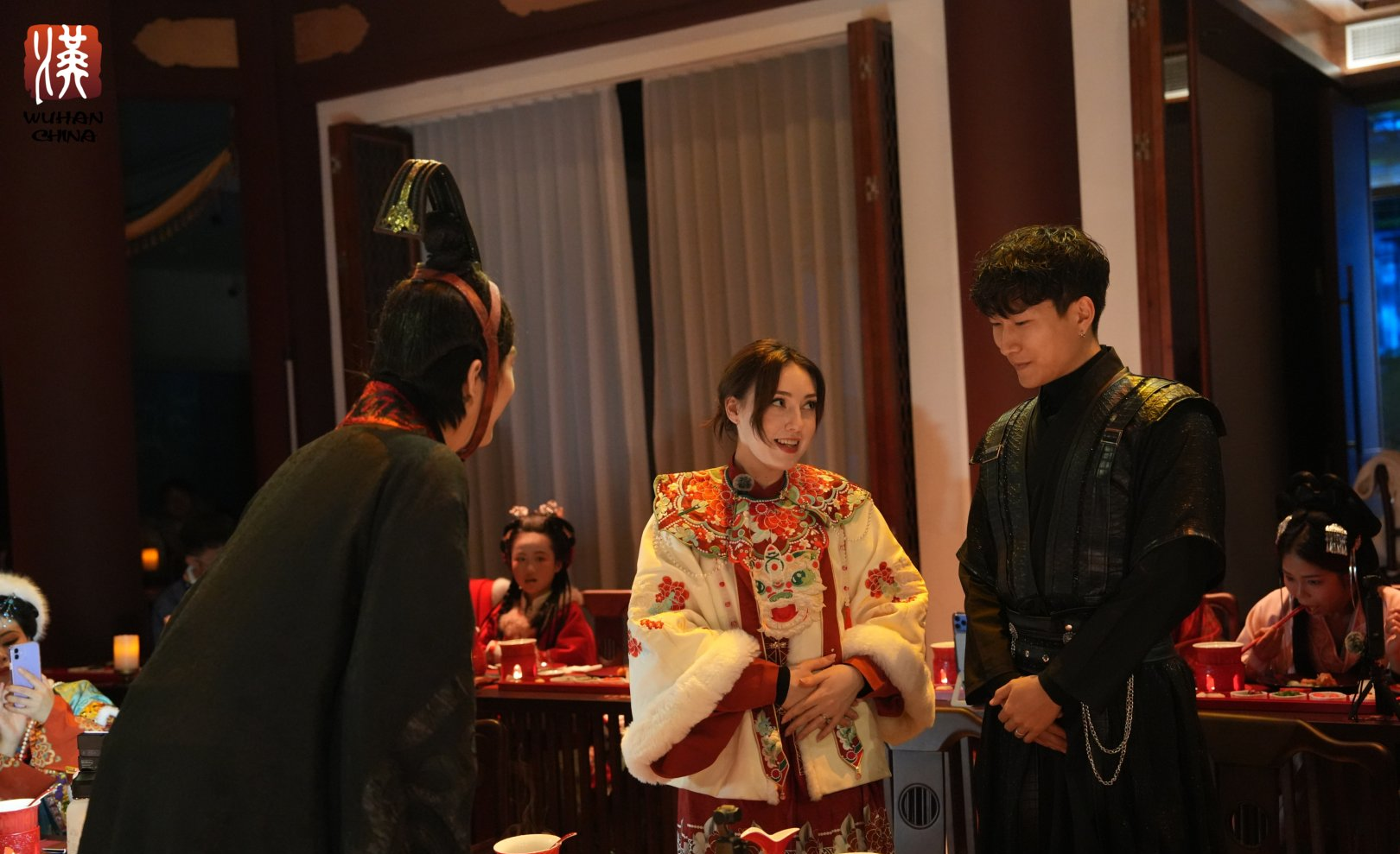 当晚5点半,在知音殿的换装打卡区,达人们纷纷换上心仪的汉服。马来西亚博主Chloe身着一袭粉色汉服,手持流苏伞,优雅的姿态引得其他达人纷纷举起手机拍摄,连连赞叹“特别美!”晚上6点30分,一场穿越千年的文化盛宴——“三国群芳宴”在知音殿内开演。来自俄罗斯的博主安娜与丈夫坐在席间,现场开启直播,兴奋地向粉丝介绍:“我们正在体验充满武汉特色的演出,还可以一边用餐一边欣赏!”