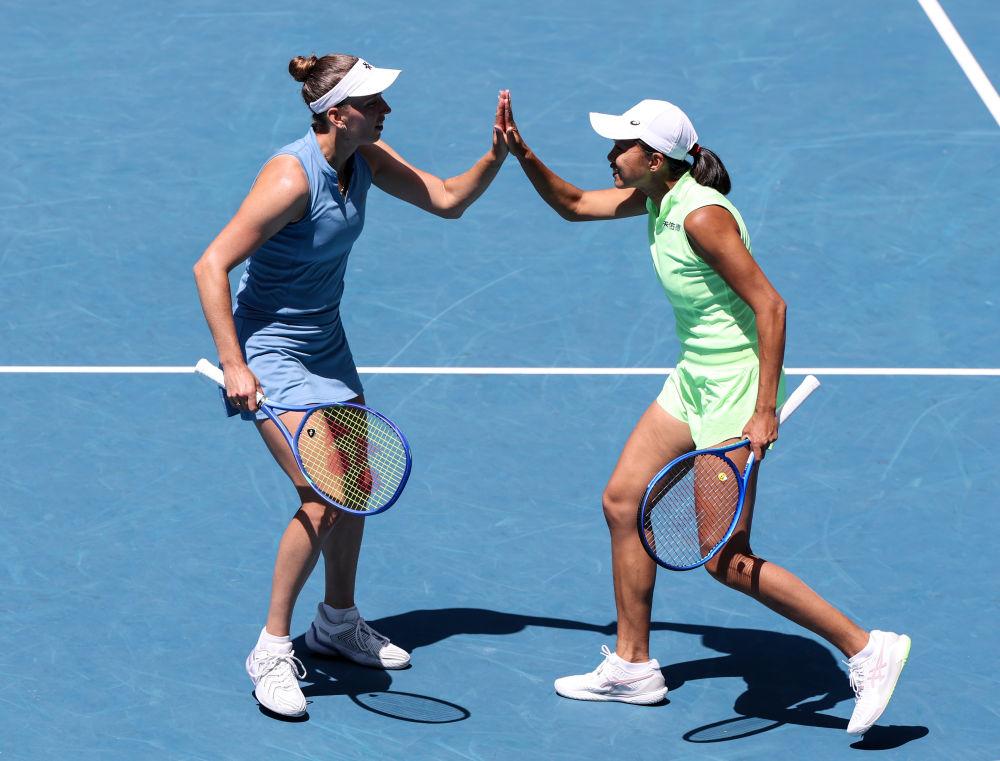 1月31日,张帅(右)/梅尔滕斯在比赛中庆祝得分。新华社记者 马平 摄