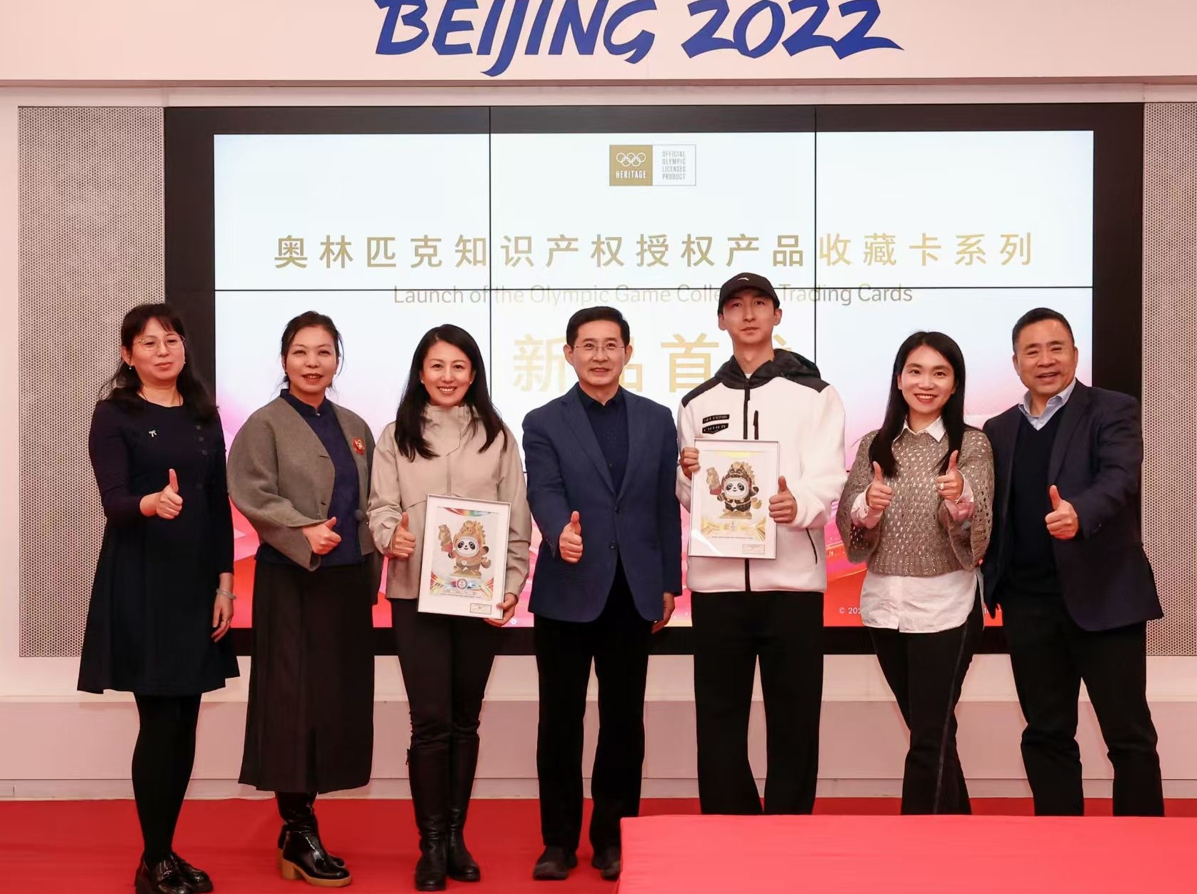 奥运冠军杨扬(左三)、武大靖(右三)与奥运卡牌设计师展示“马墩墩”艺术收藏卡。