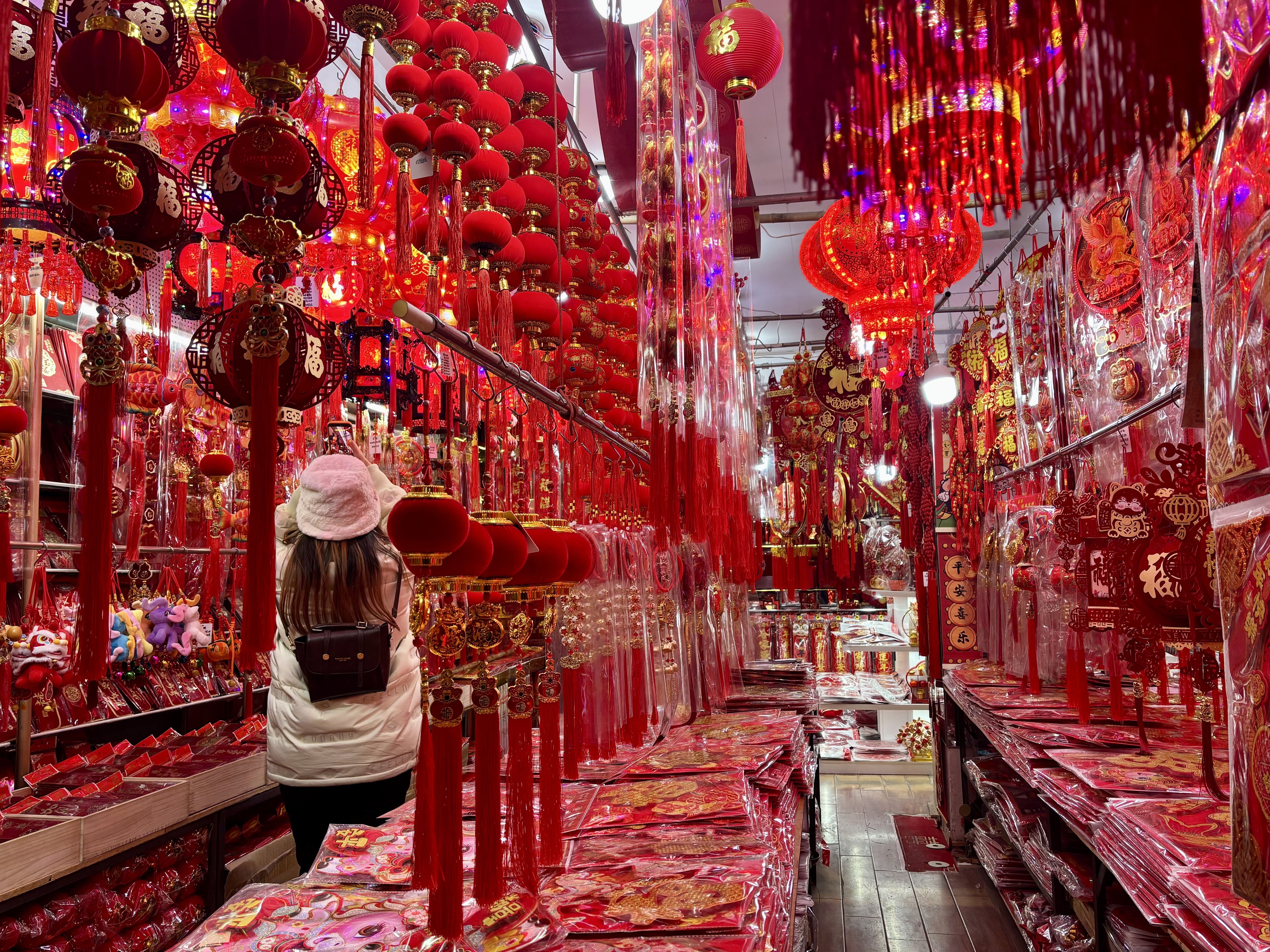 汉正街商铺内琳琅满目的节庆商品汇成一片红色海洋。 栾嘉雯 摄