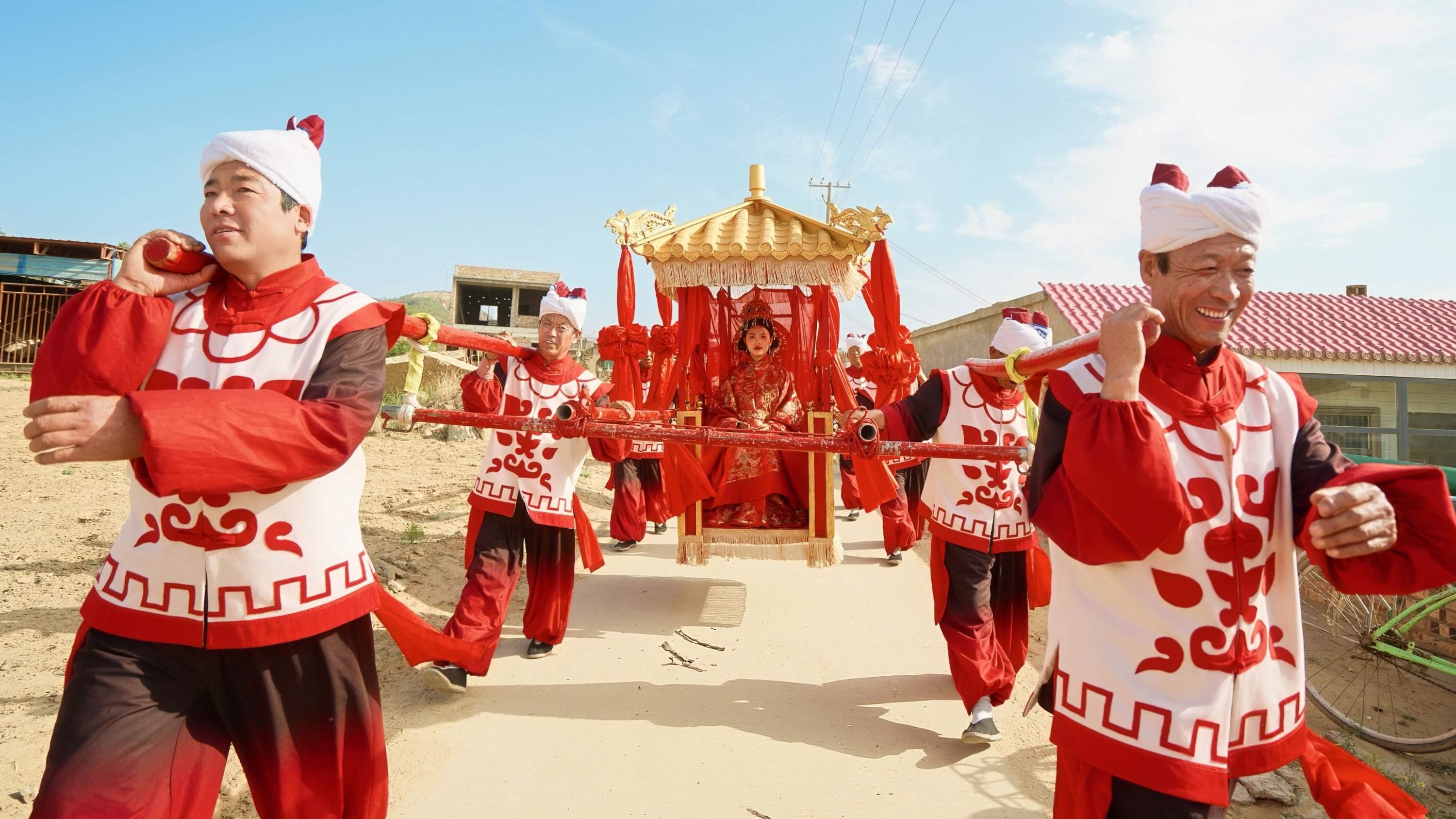 陕西榆林的牛小成,选择了更为隆重的传统形式。2025年5月,他的婚礼轰动乡里。32抬大轿,锣鼓开道,陕北大秧歌非遗表演紧随其后,十里八乡的人都来看热闹。