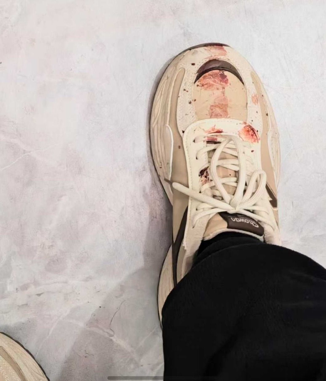 宋小龙医生在陪同患者的过程中的鞋袜被鲜血染红。
