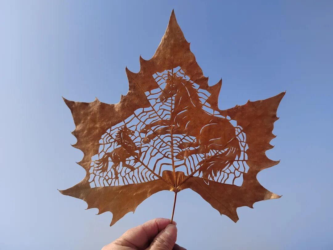 看着一片落叶慢慢被刻出骏马的身影,或奔跑或静卧或嬉戏……