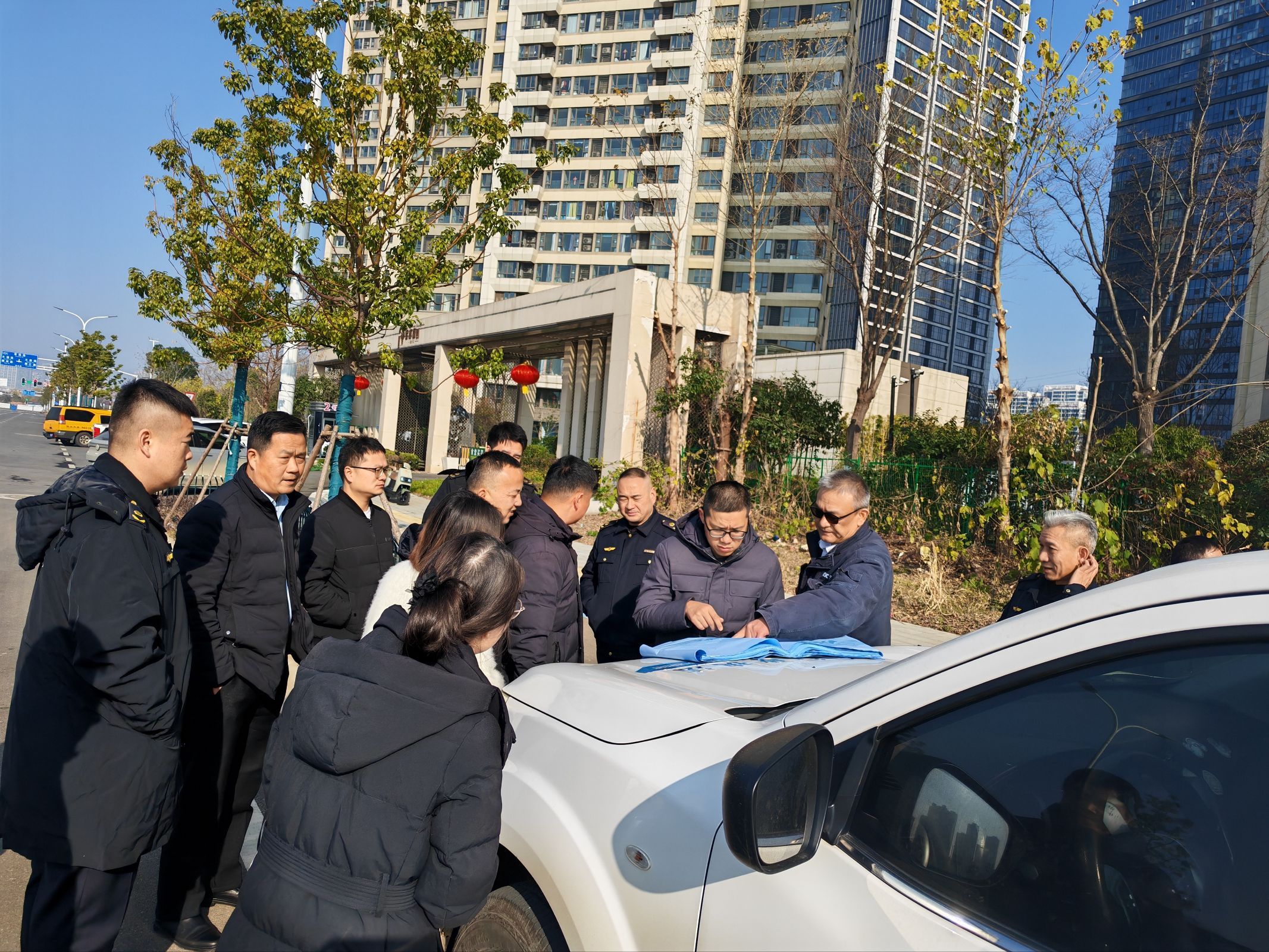 2026年1月7日10时,接到物业公司求助后,永合社区党支部书记王雅薇抱着试试看的想法,电话联系了沌口街综合执法中心。当天14时30分,中心负责人黄友纯就带队来到现场勘查,并征询交管方面的意见。