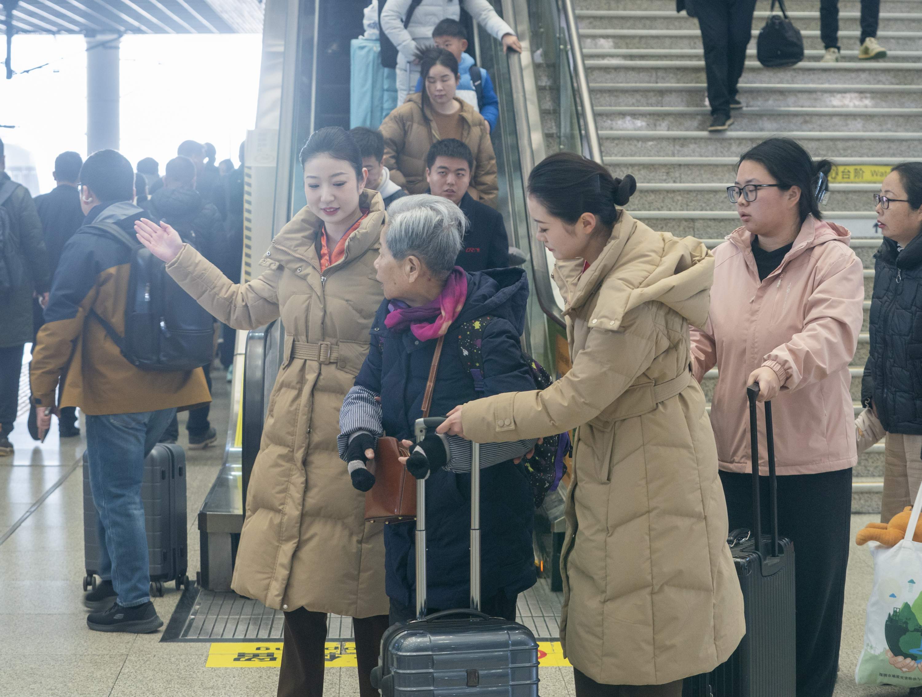 2026春运首日,武汉站工作人员帮助老人。(湖北日报全媒记者 魏铼 摄)