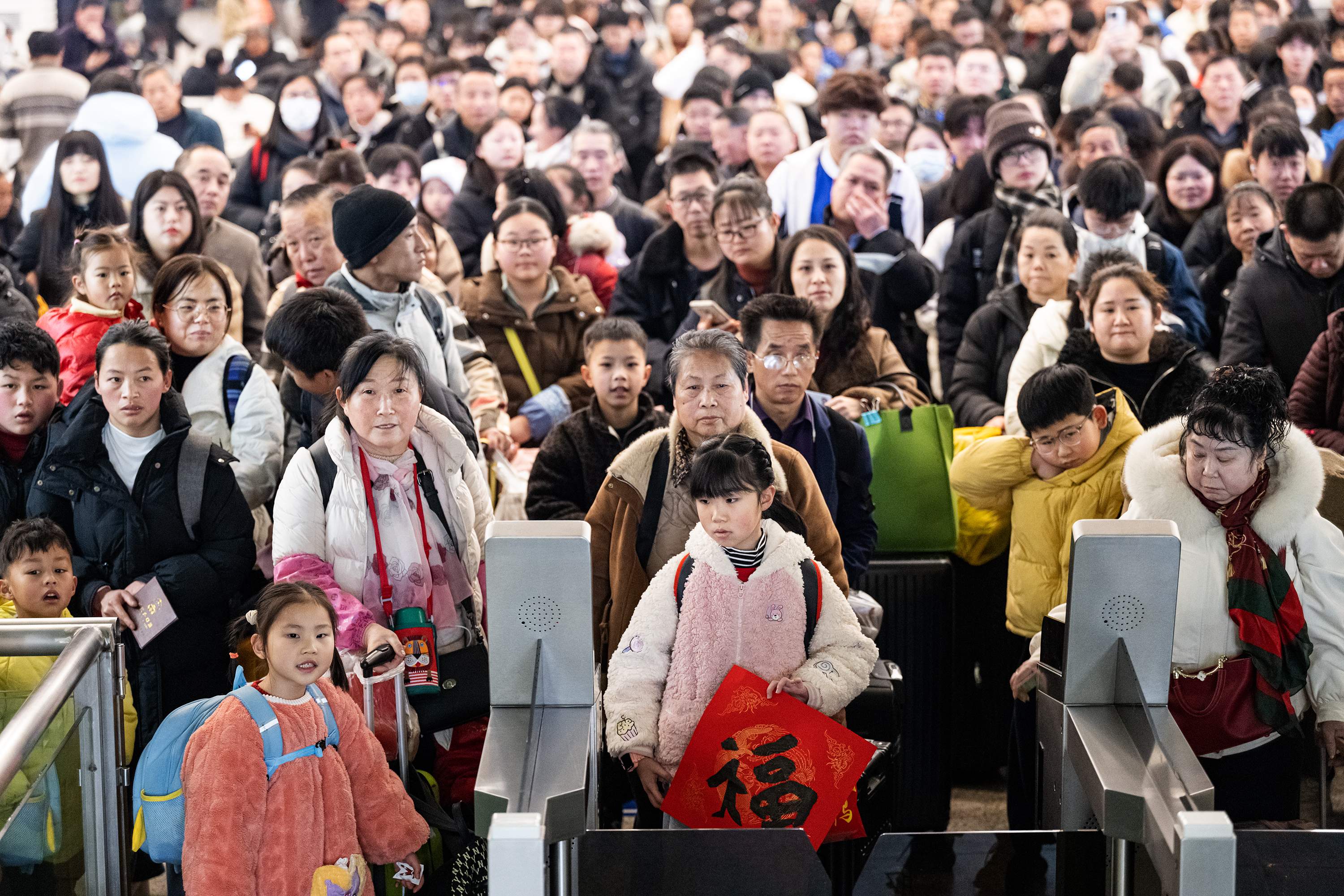 2月2日,在汉口火车站,一名小朋友带着“福”字和家人准备乘车返乡。(湖北日报全媒记者 任勇 通讯员 宋萍 邱晟 摄)