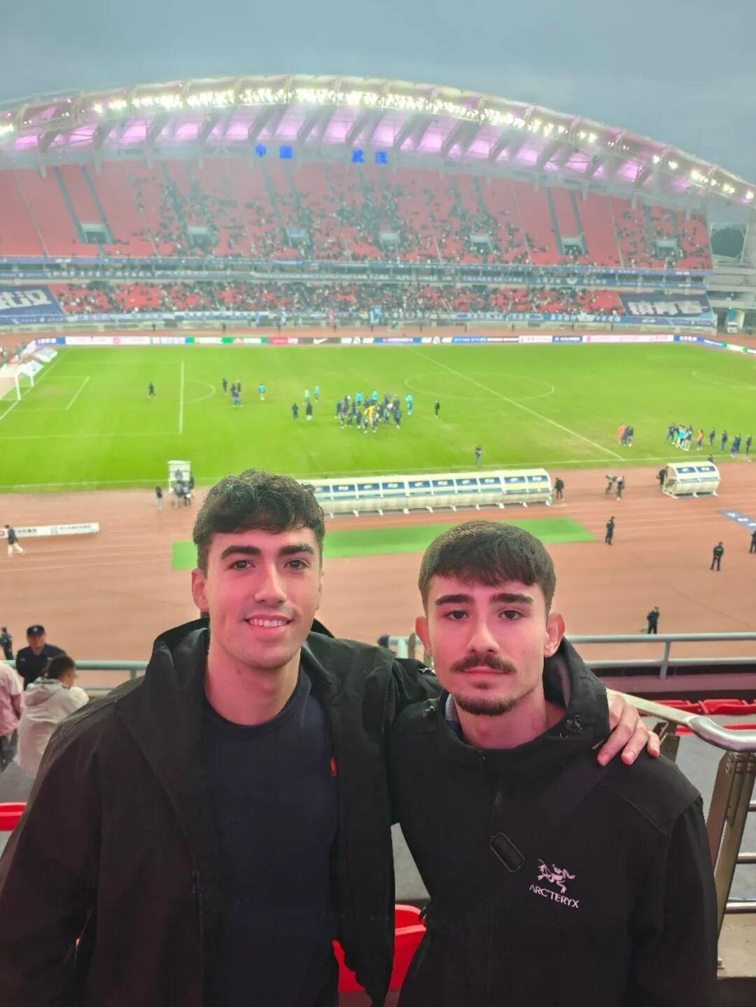 西班牙籍留学生李安(左)和弟弟在武汉的球场观看球赛。