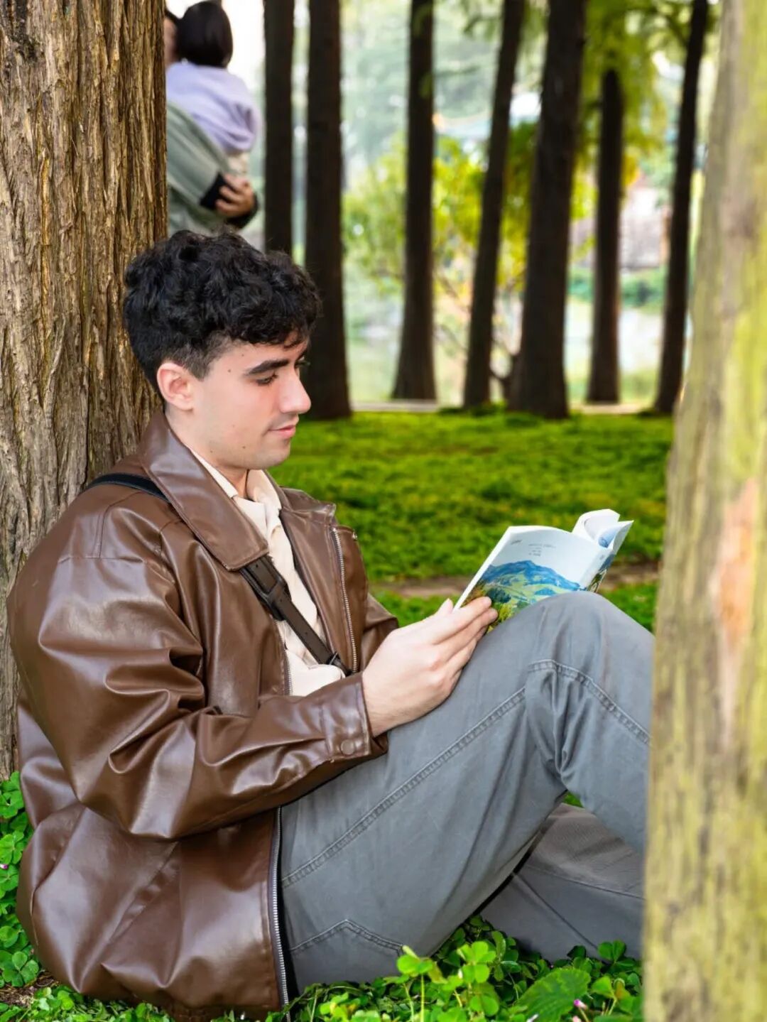 西班牙籍留学生李安在东湖畔的林间阅读。