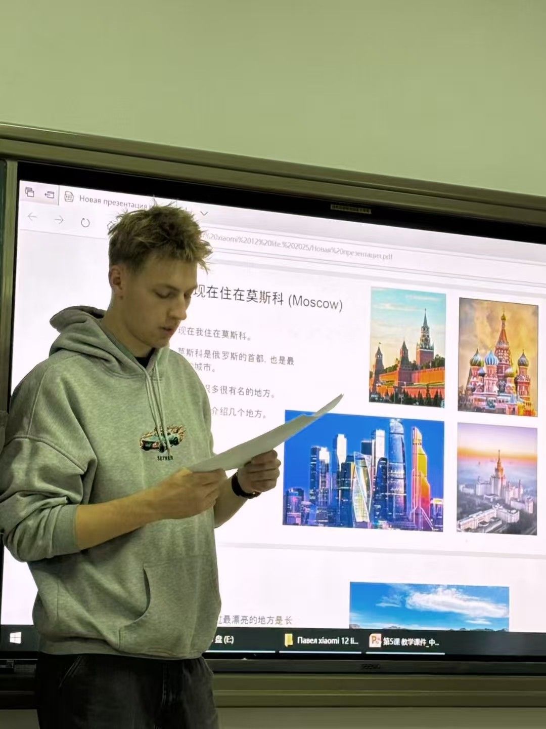帕韦尔在课堂上向大家介绍俄罗斯。