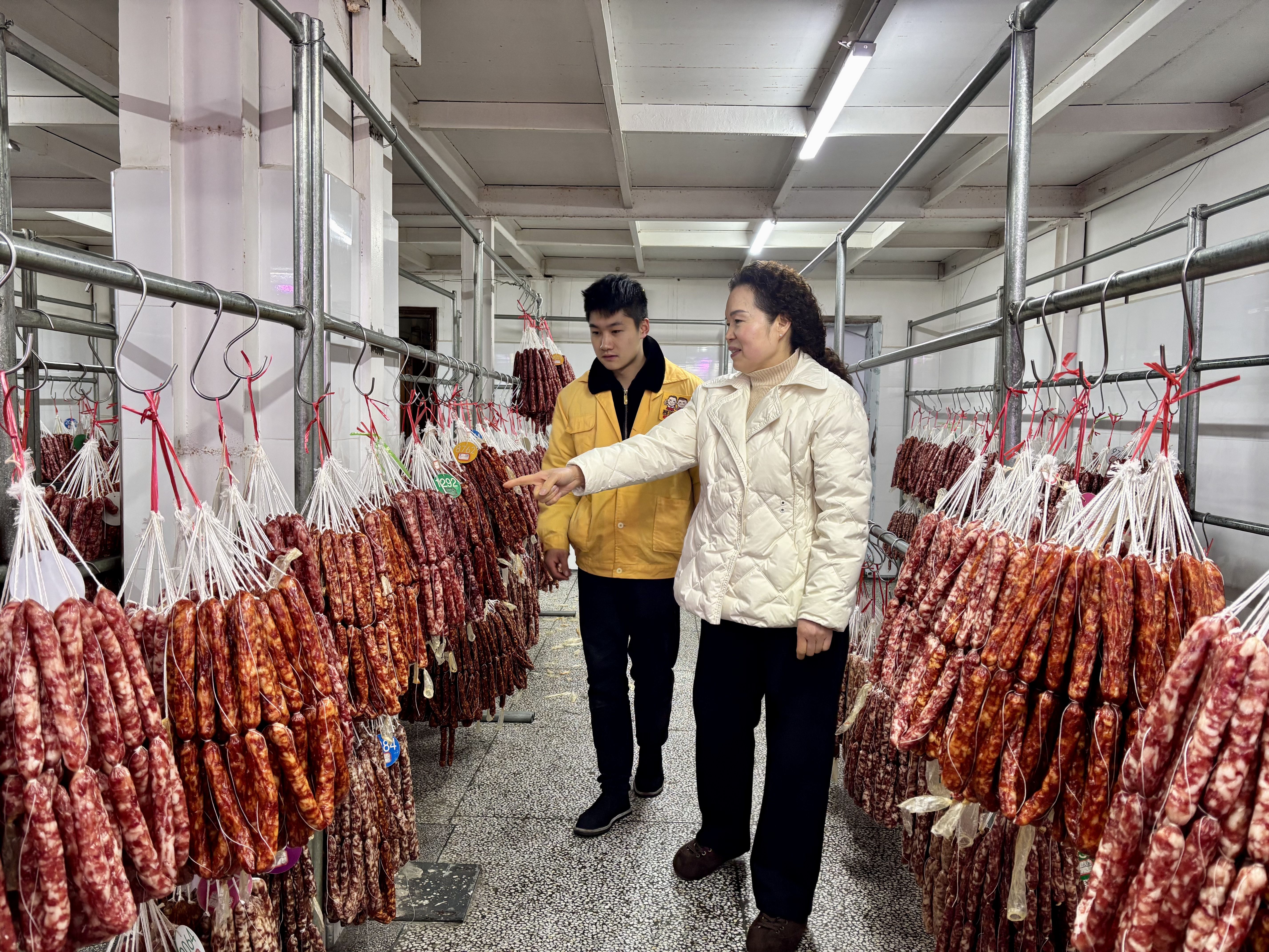 陈春梅(右)和员工一起查看等待居民前来取货的腊肠。栾嘉雯 摄