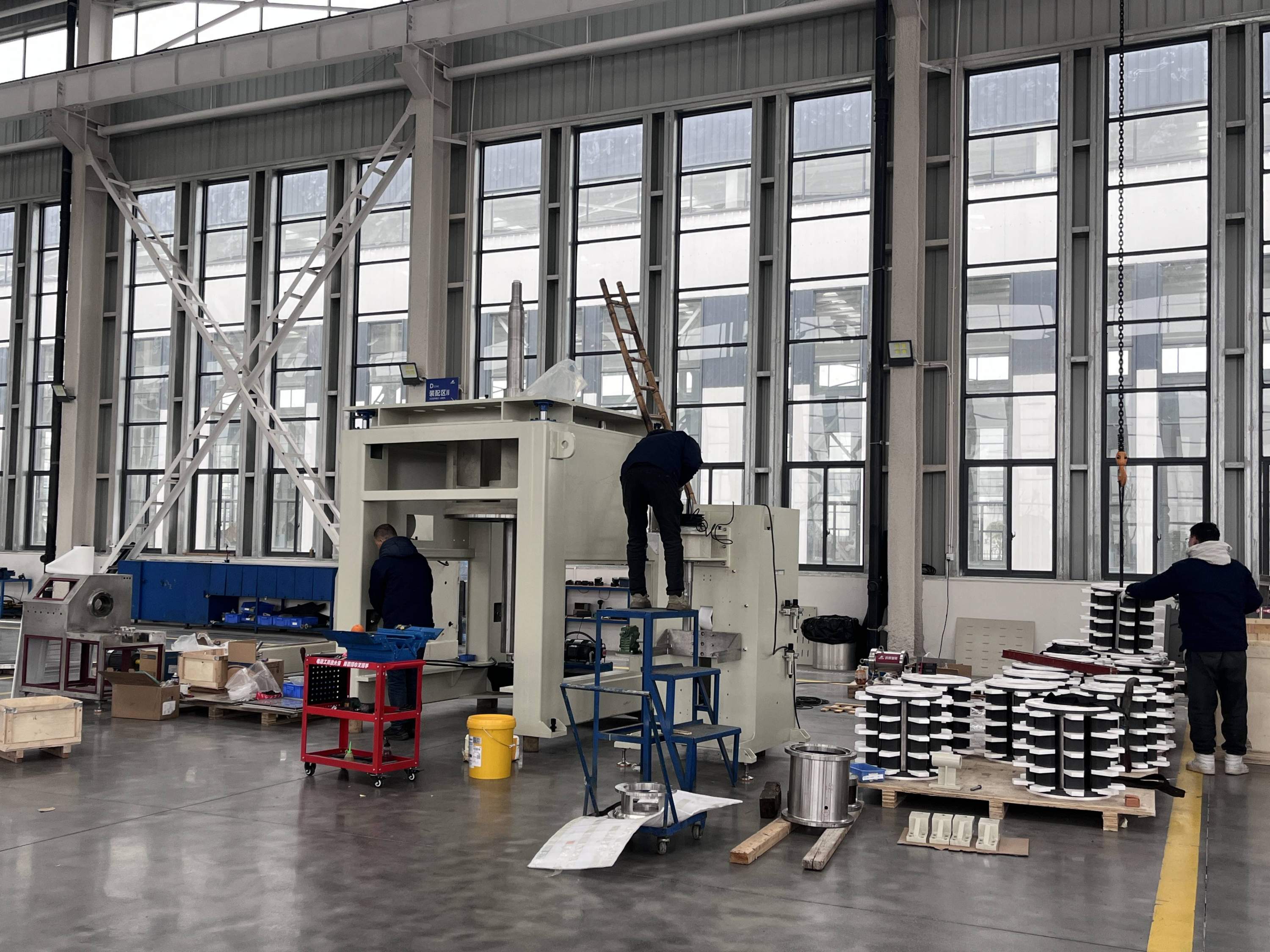 襄阳鸿凯智能装备有限公司厂房内,3名工人正在装配智能研磨设备。(湖北日报实习生 高子函 摄)