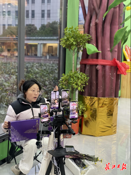 主播在直播推广洪山菜薹。记者占思柳 摄
