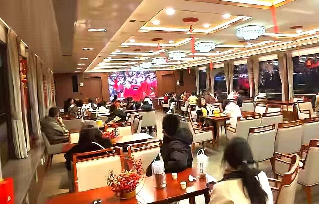 游客一起在游船室内大屏看春晚。