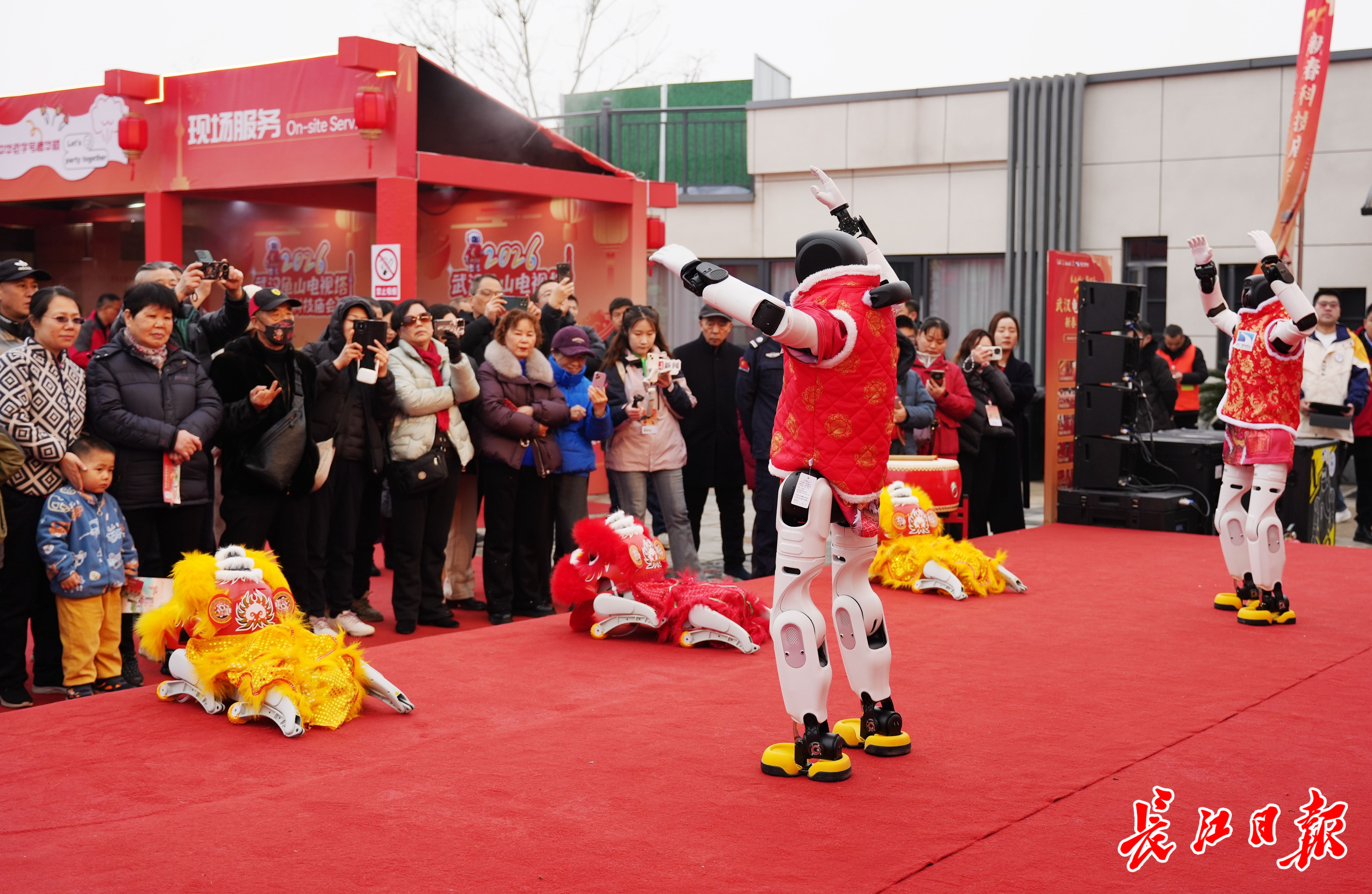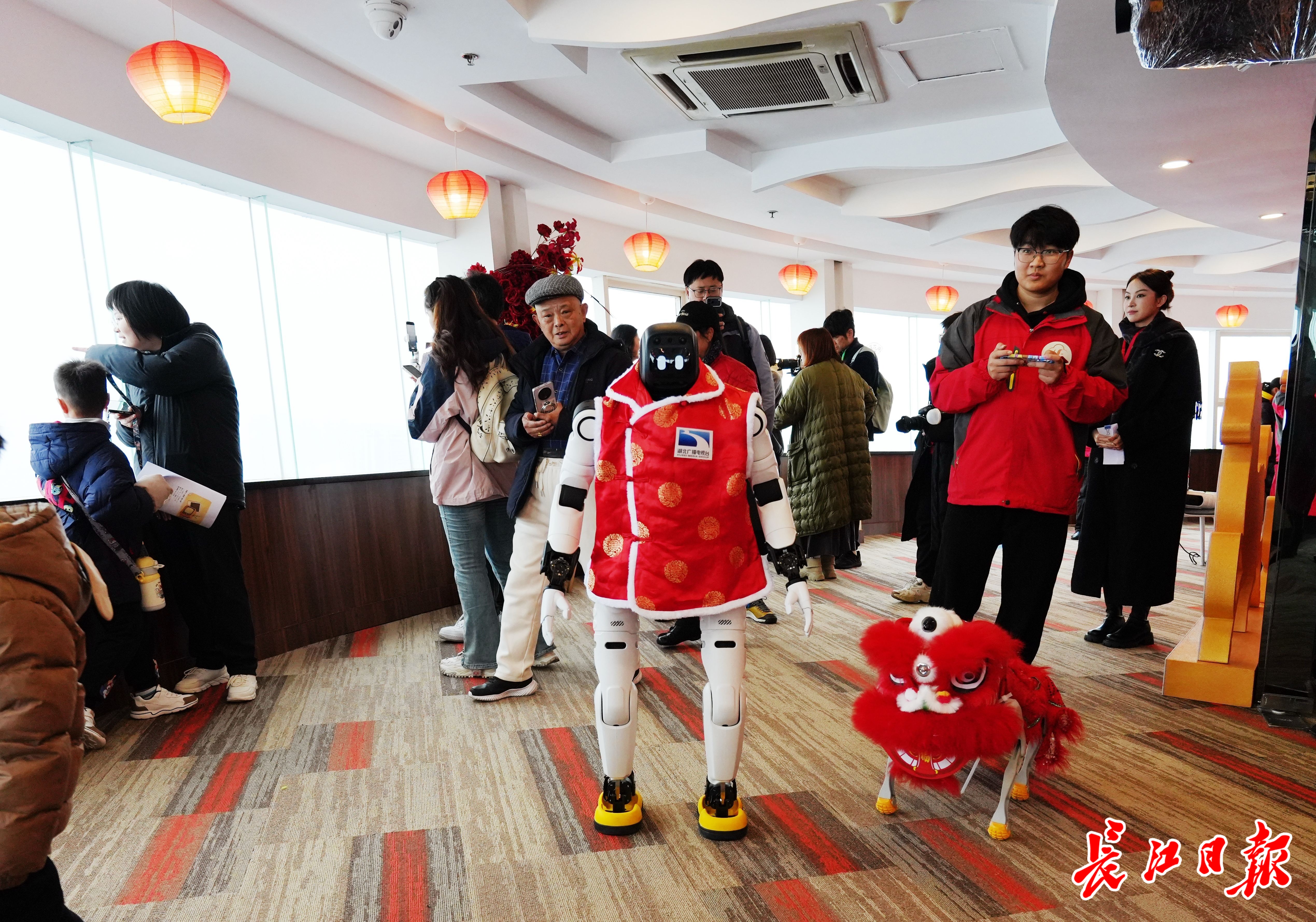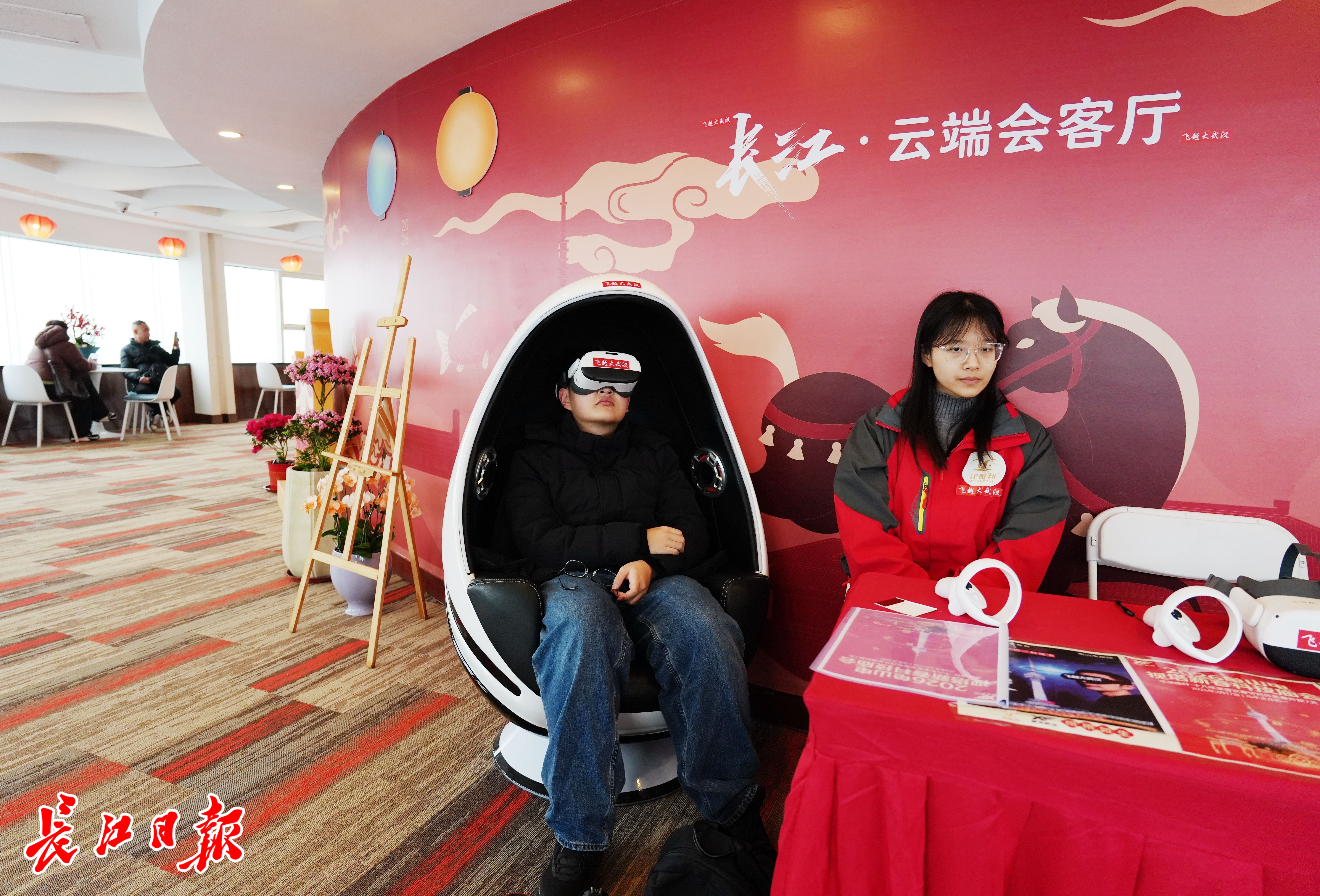 春节期间,龟山电视塔融合大健康、新文旅、泛娱乐、智能化四大元素,打造全新的文旅体验。在77层观景平台,智能机器人与机器狗与游客趣味互动,并为游客讲解黄鹤楼、武汉长江大桥等地标背后的故事。游客还能戴上VR眼镜,体验“飞跃武汉”。此外,从大年初一到初七,塔前广场正在举办一场融合文艺展演、MR混合现实体验、AI机器人互动的科技庙会嘉年华,传统年味与现代科技交织,吸引众多游客驻足体验。