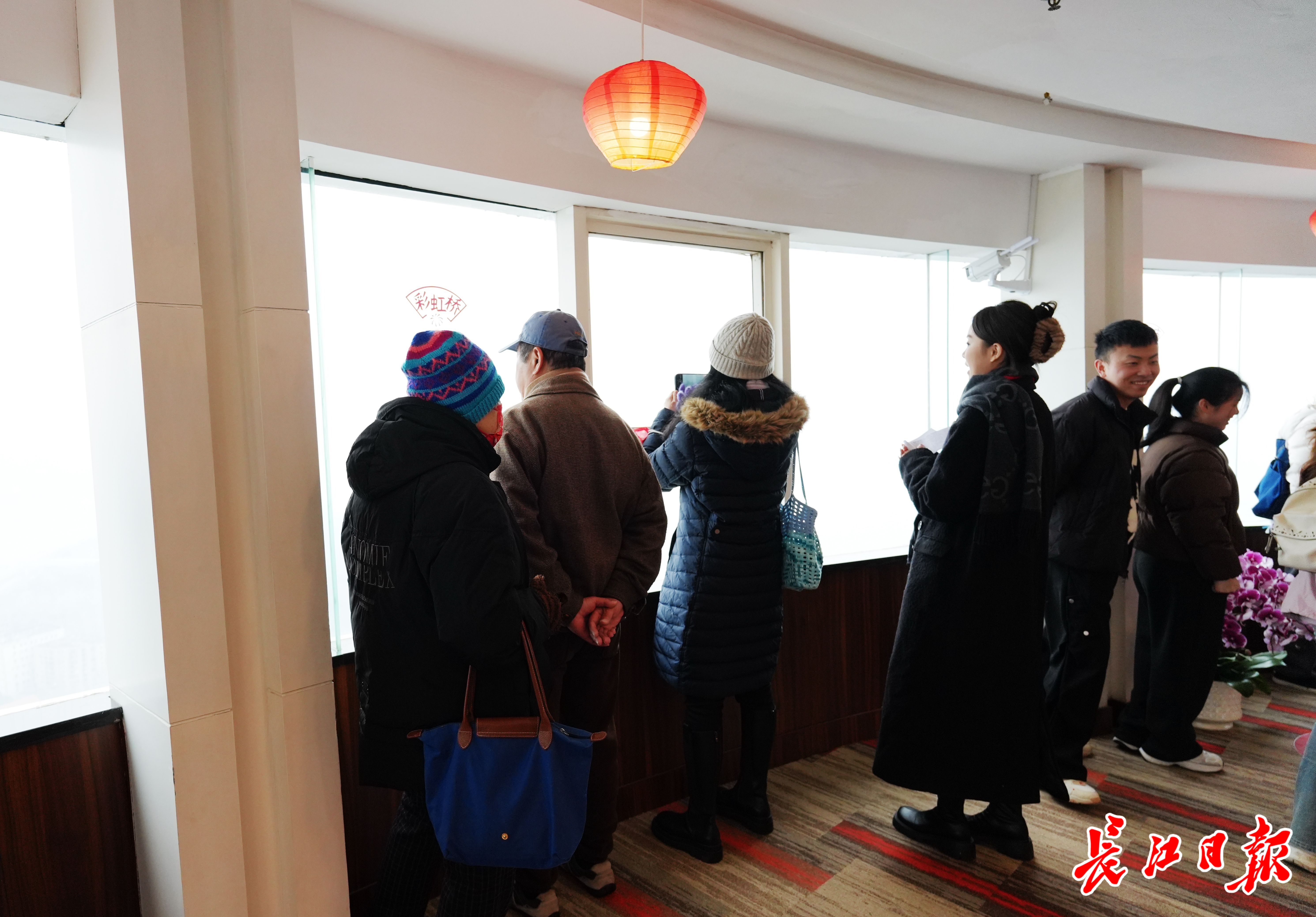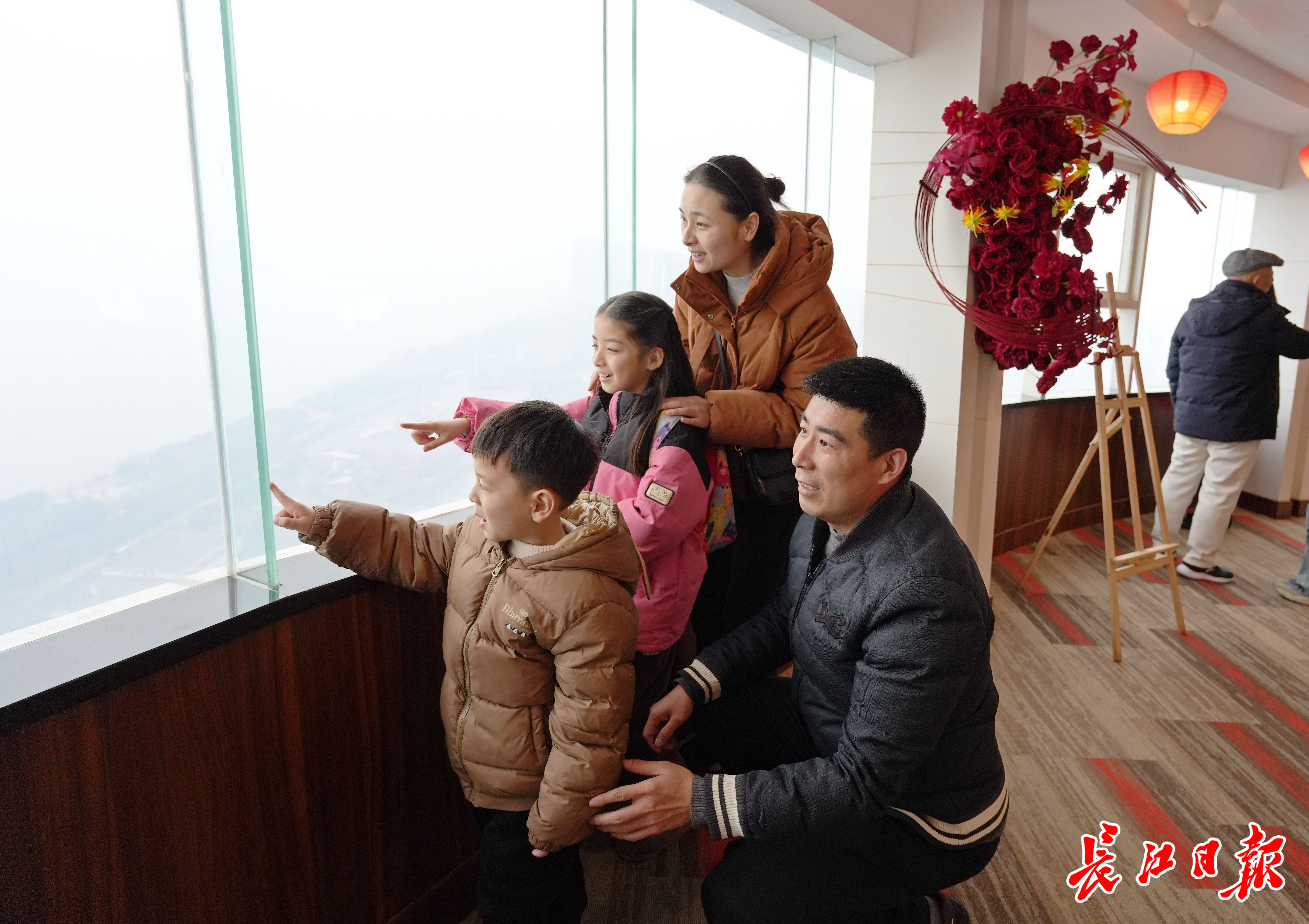 游客中不乏外地访客。“看,那是长江大桥,江面上还有轮渡、游船。”来自湖北黄冈的王威带着妻子、9岁女儿和5岁儿子一同登塔。生于1986年的他笑着说:“我和电视塔算是‘同岁’。马年第一天全家一起来登高,特别有意义。”王威一家前一天下午自驾到武汉,已在长江大桥上漫步赏景;今天则从高空视角,再次领略“万里长江第一桥”的雄姿,隔江远眺黄鹤楼,更觉心旷神怡。