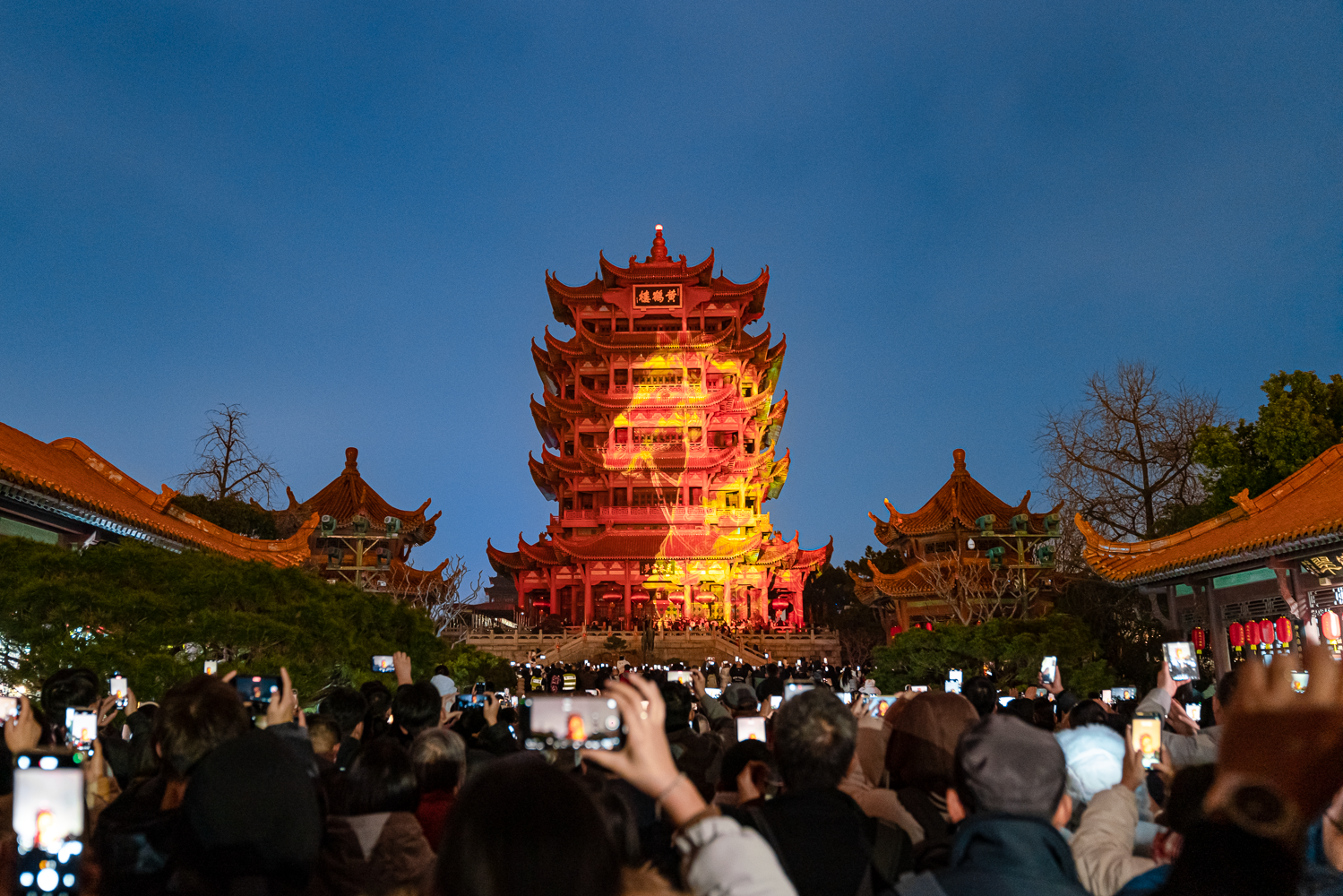 大年初一晚,“夜上黄鹤楼”为全国游客送上马年祝福。景区供图
