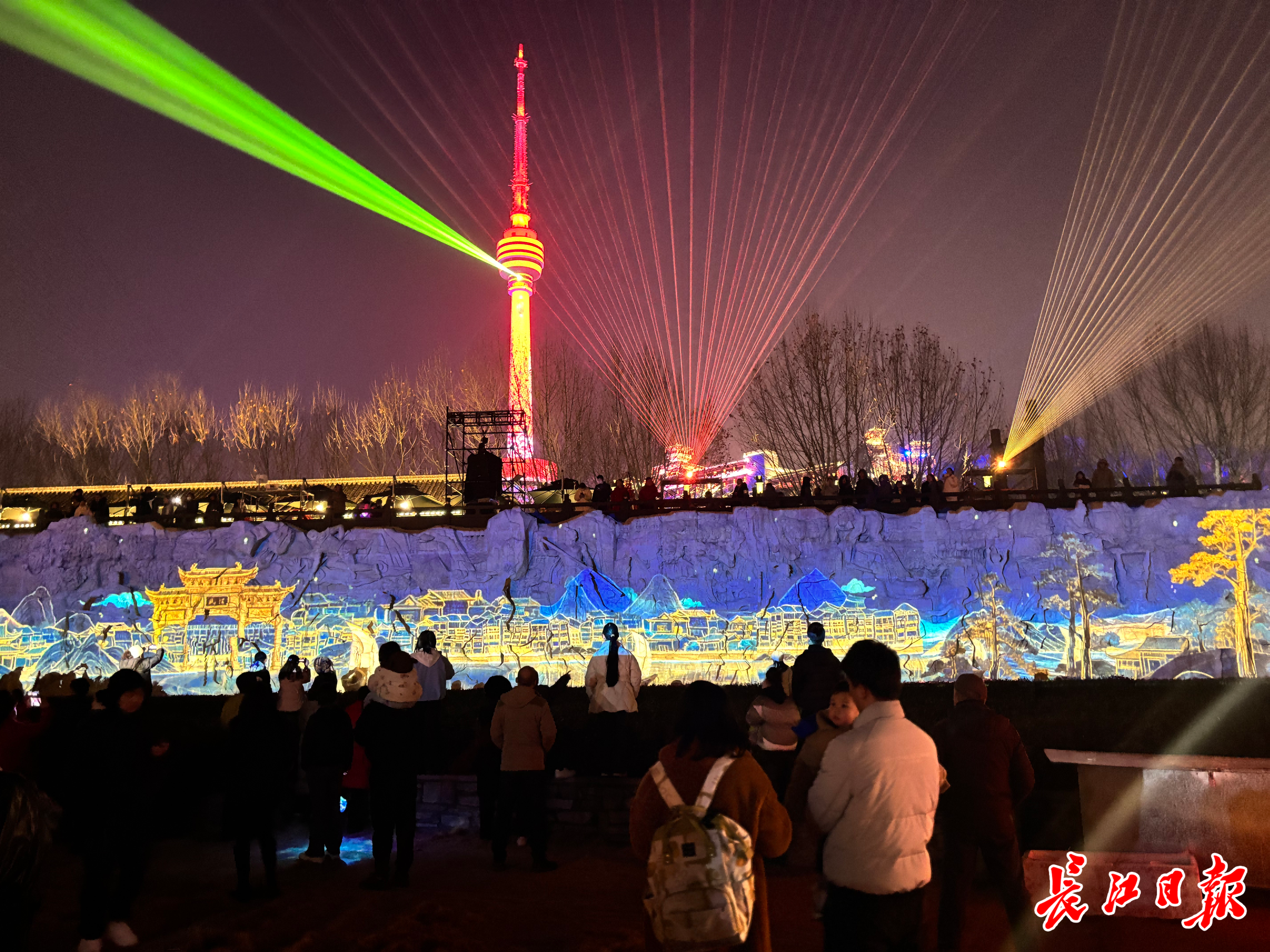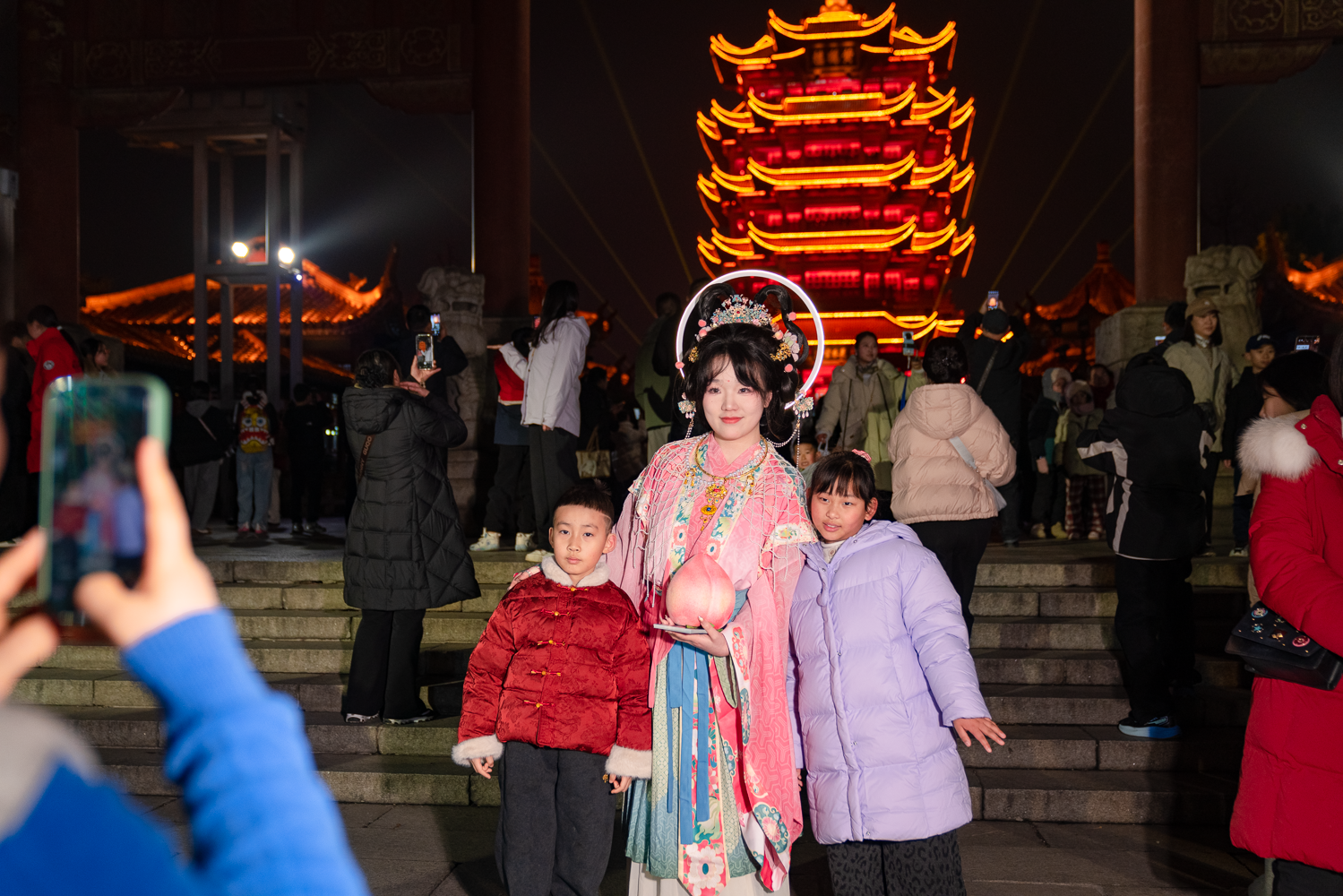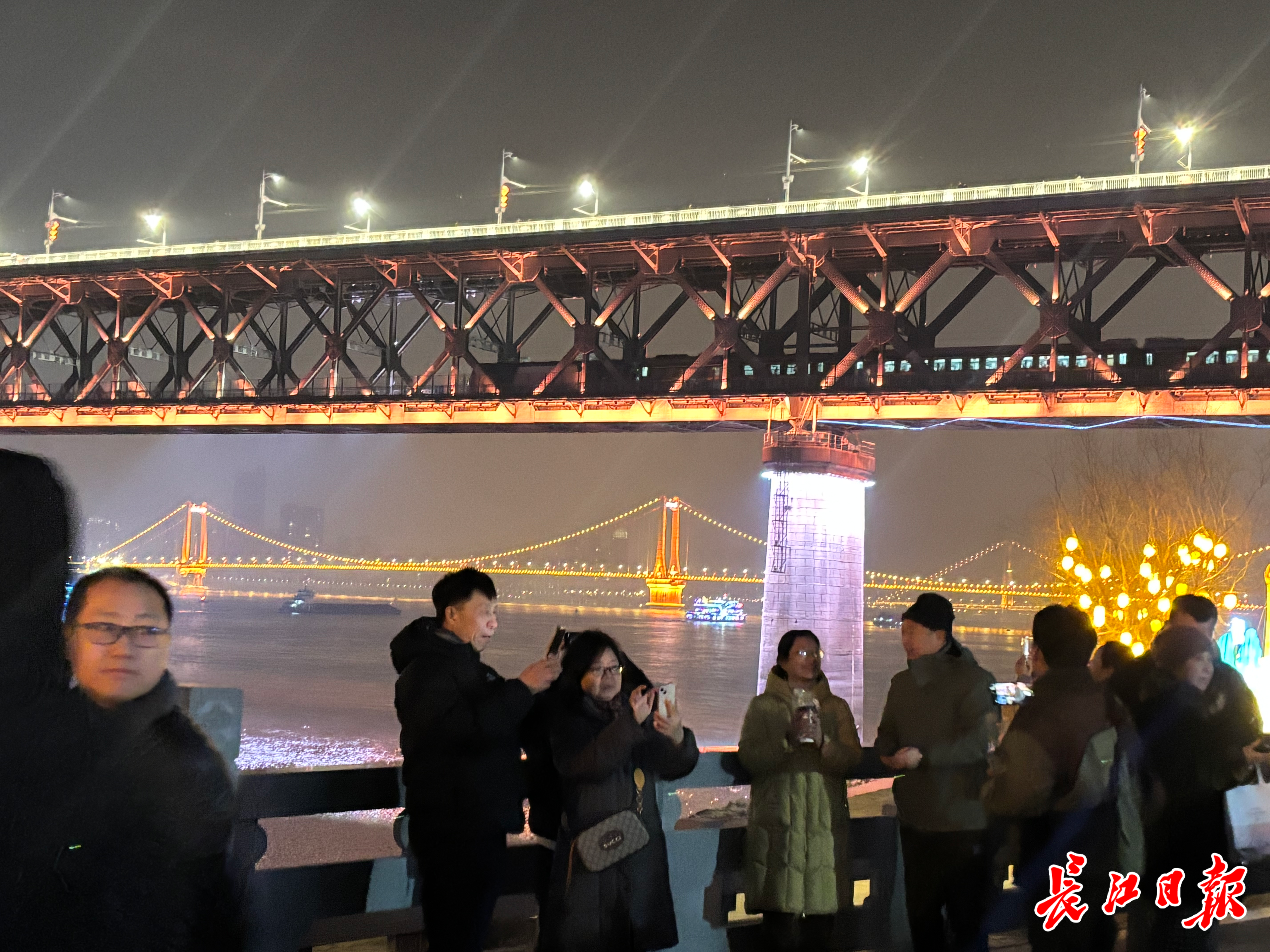 从黄鹤楼西门走到长江大桥上,在桥头堡,众多游客举着相机、手机,拍摄黄鹤楼夜景。大桥底下,斗级营、户部巷都是灯火辉煌。斗级营街区以“斗里藏福 马上暴富”为主题开启新年活动,主打文化体验与消费互融,日均客流量近4万人次,成为今年春节新兴打卡地。在户部巷,“超启新春寻味户部巷—年味满街巷”新春主题活动开启,打造特色霓虹光影与夜间景观带,开设“新春潮味市集”汇聚年味美食与文创好物,引爆街区消费热潮,日均客流量8万至10万人次。