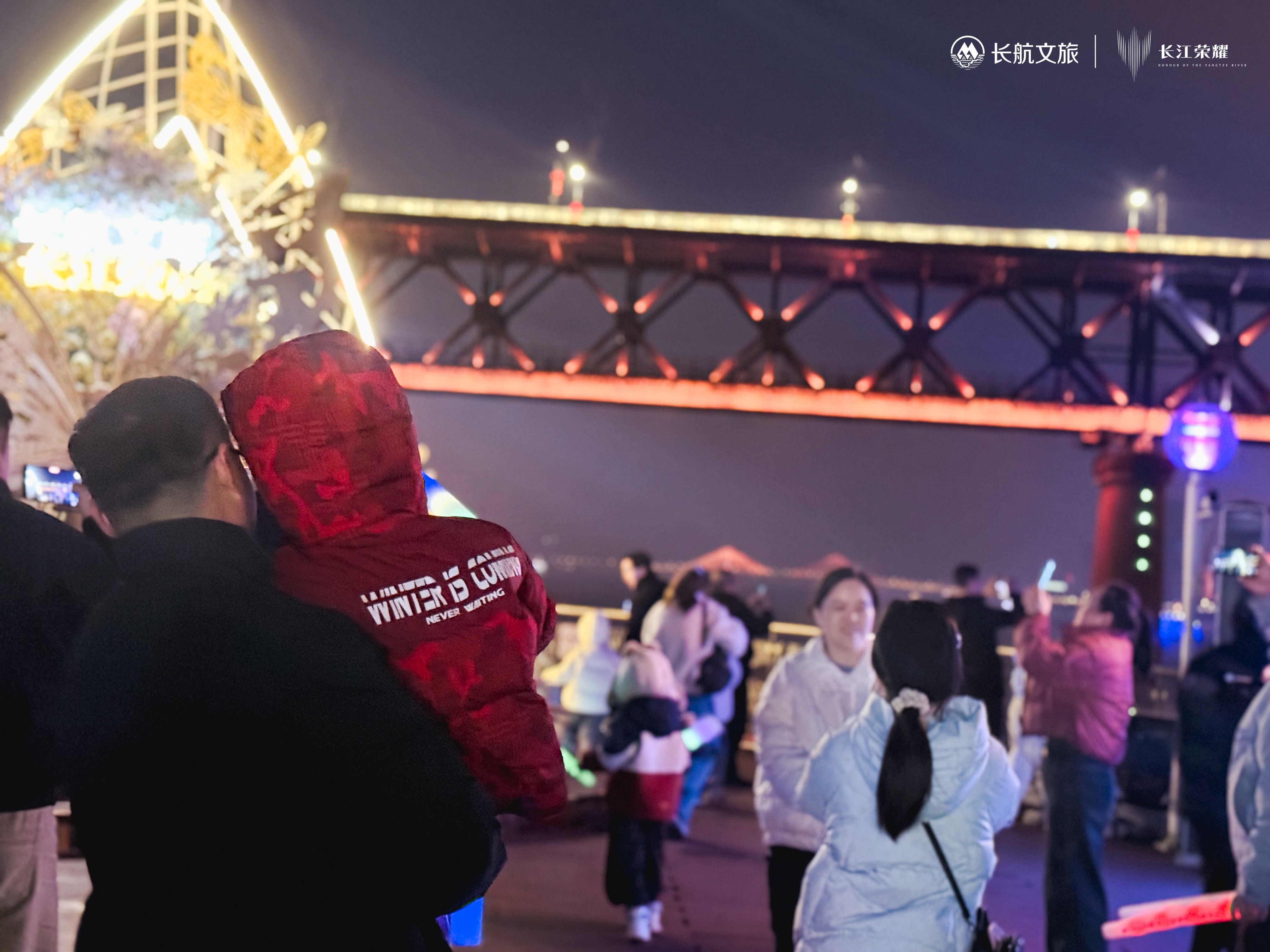 “快看!亮了!”甲板上,一位来自山东的小朋友兴奋地指着岸边。刹那间,长江灯光秀瞬间点亮,绘就一幅全民情感与城市文化交织的全景光影长卷。两岸的高楼大厦仿佛被施了魔法,奔腾的骏马登上楼宇立面。樱花、热干面等在光影中跳跃,新春的祝福洒满整座城市。