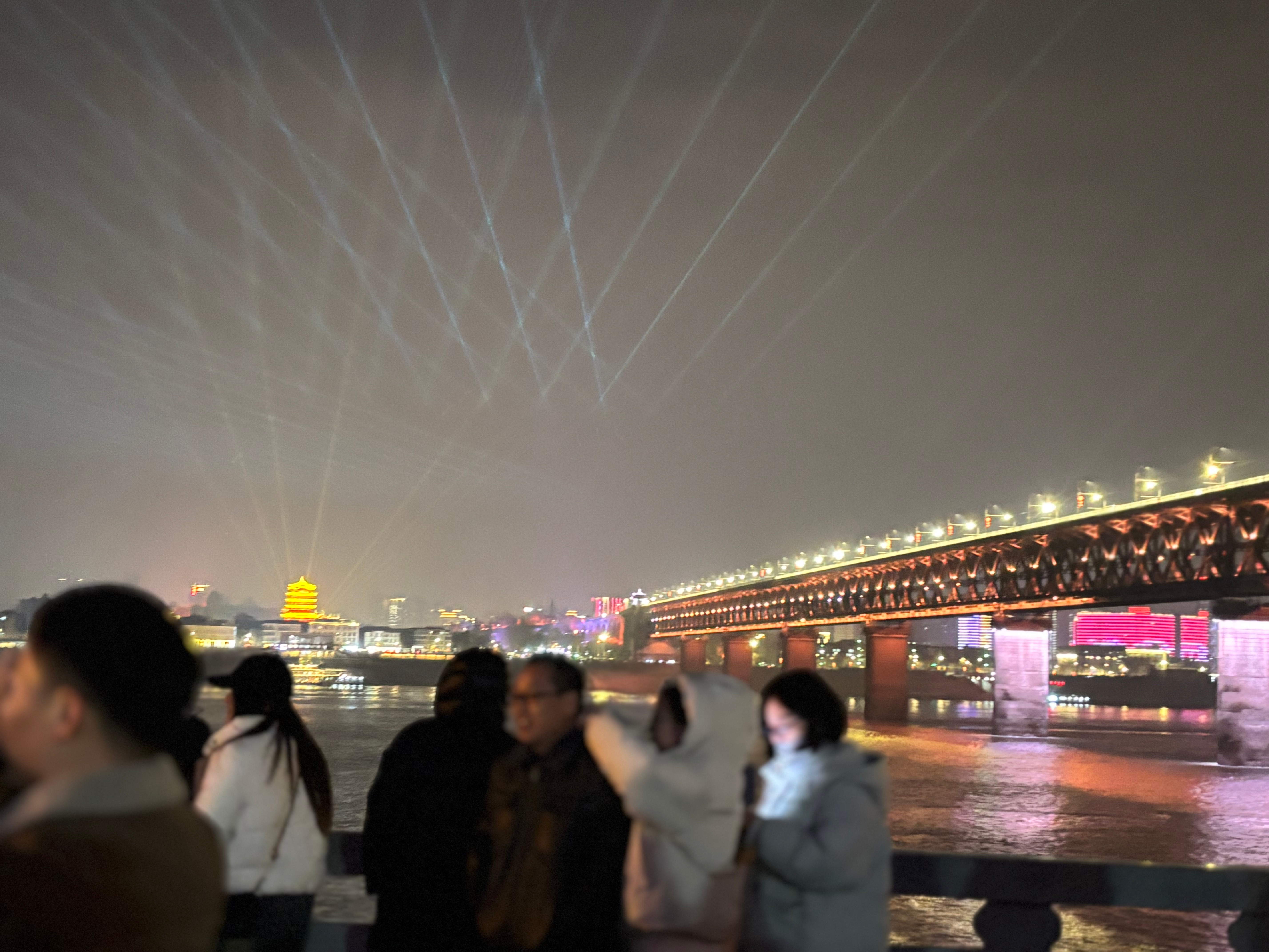 “这里不仅能看到巨型花灯,还能看到夜色中的绿皮火车从长江大桥经过,刚刚我们去过的黄鹤楼也能隔江看到,长江在灯光的映衬下波光粼粼,江面上的游船闪烁着灯光,真的很美。”来自四川乐山的14岁男生小李以长江为背景,妈妈给他录了一段视频。