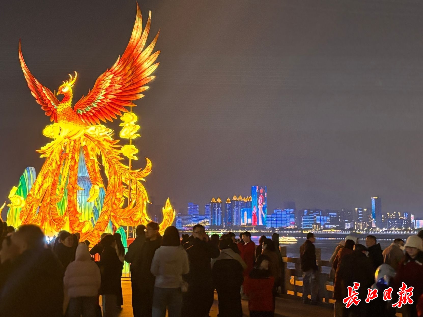 从黄鹤楼远眺对岸,汉阳江滩早已是一片灯的海洋。夜晚8点,2026新春晴川灯会人气爆棚,大批市民与外地游客如约而至,共赴江畔光影之约。高达十三米的“凤舞九天”灯组,金羽辉煌,与黄鹤楼、武汉长江大桥、龟山电视塔等地标相映成趣,呈现出一幅“江汉揽胜”夜图景,将江城韵味展现得淋漓尽致。