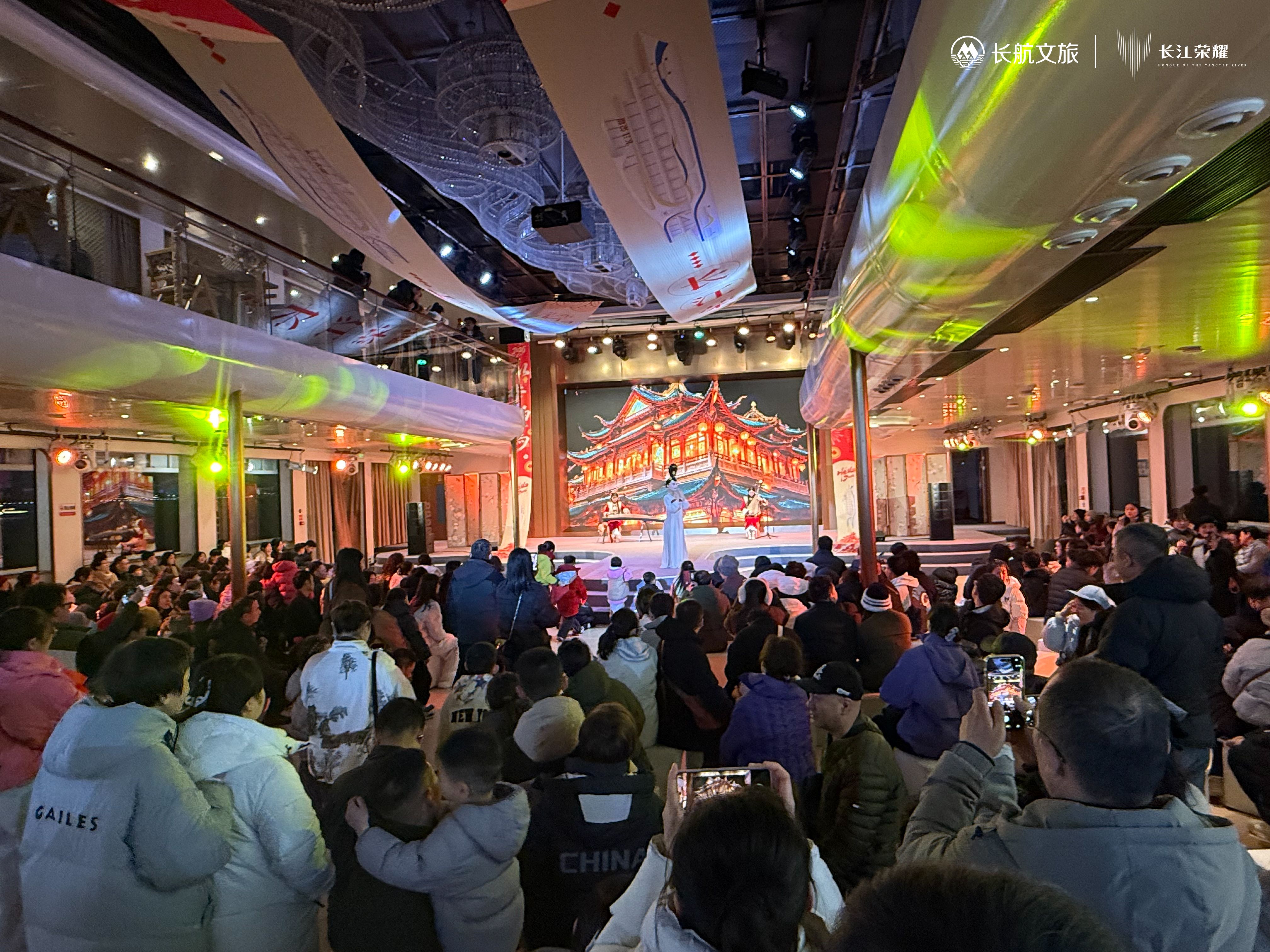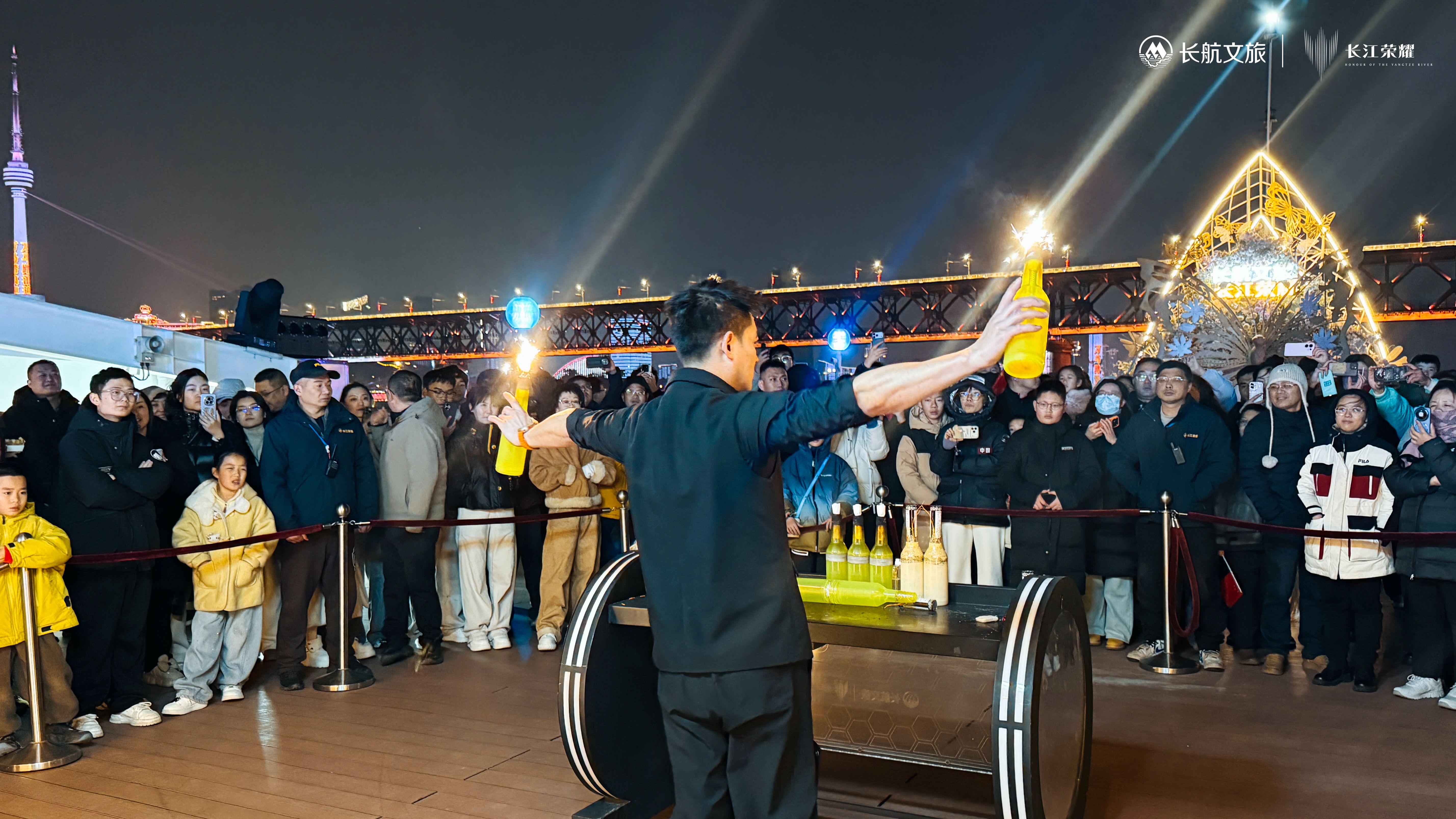 游船缓缓穿过武汉长江大桥,桥上的车流灯光如星河般流淌,与江面的波光交相辉映。一边是黄鹤楼在夜色中闪闪发光,一边是龟山电视塔光芒四射。来自西安的李先生激动地说:“这是我首次在长江上过大年,也是第一次看到如此震撼的灯光秀。窗外的流光溢彩和船舱内的年味表演形成了奇妙的呼应,这种体验真的太独特了。”“放假以后,前来登船游玩的人一天比一天多,大年初二、初三晚上目前已显示满载。”长江荣耀号相关负责人介绍。