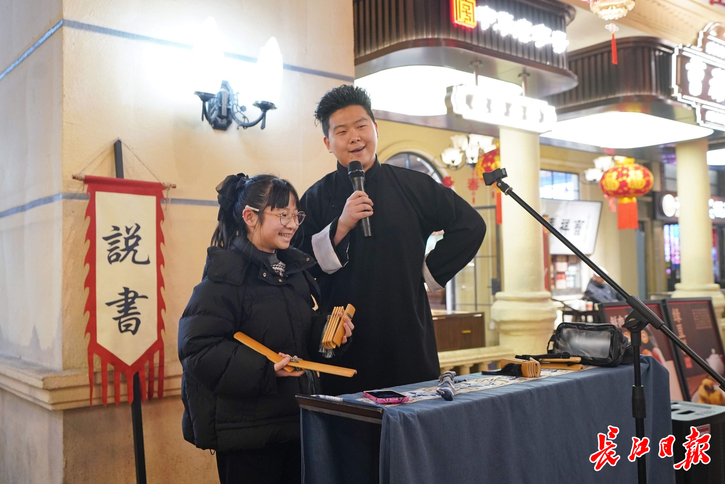 楚风汉味美食街,说书艺人与顾客互动表演。