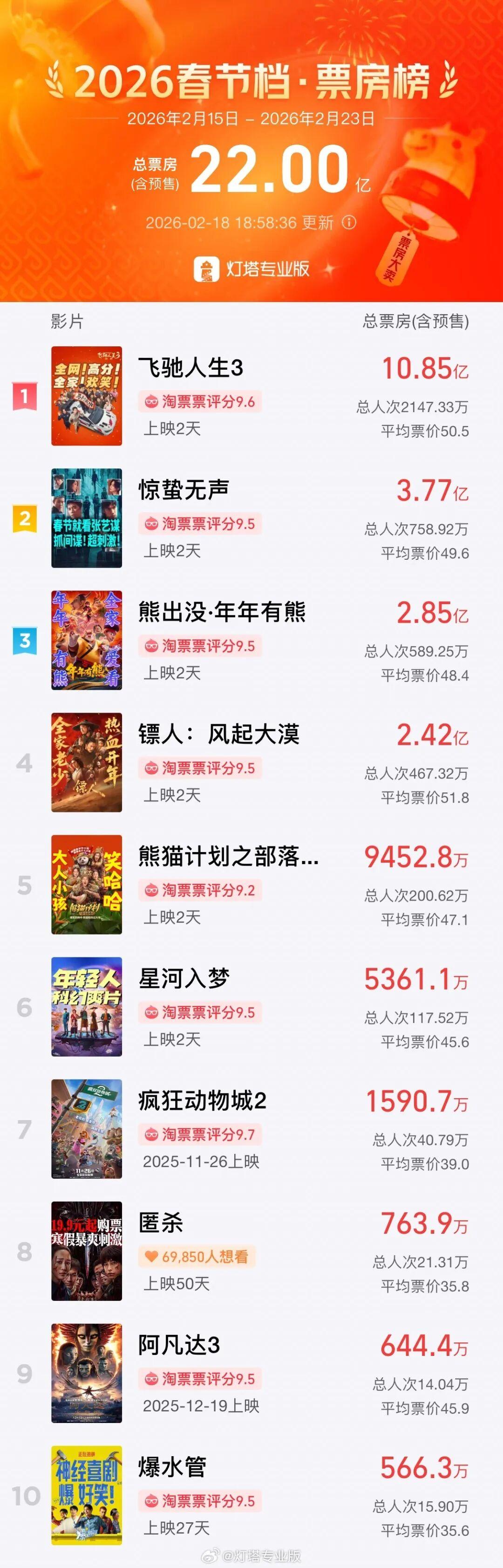 今年春节档为9天超长档期,上映影片类型丰富多样。截至2月18日18时58分,2026春节档(2月15日—2月23日)档期总票房(含预售)突破22亿。