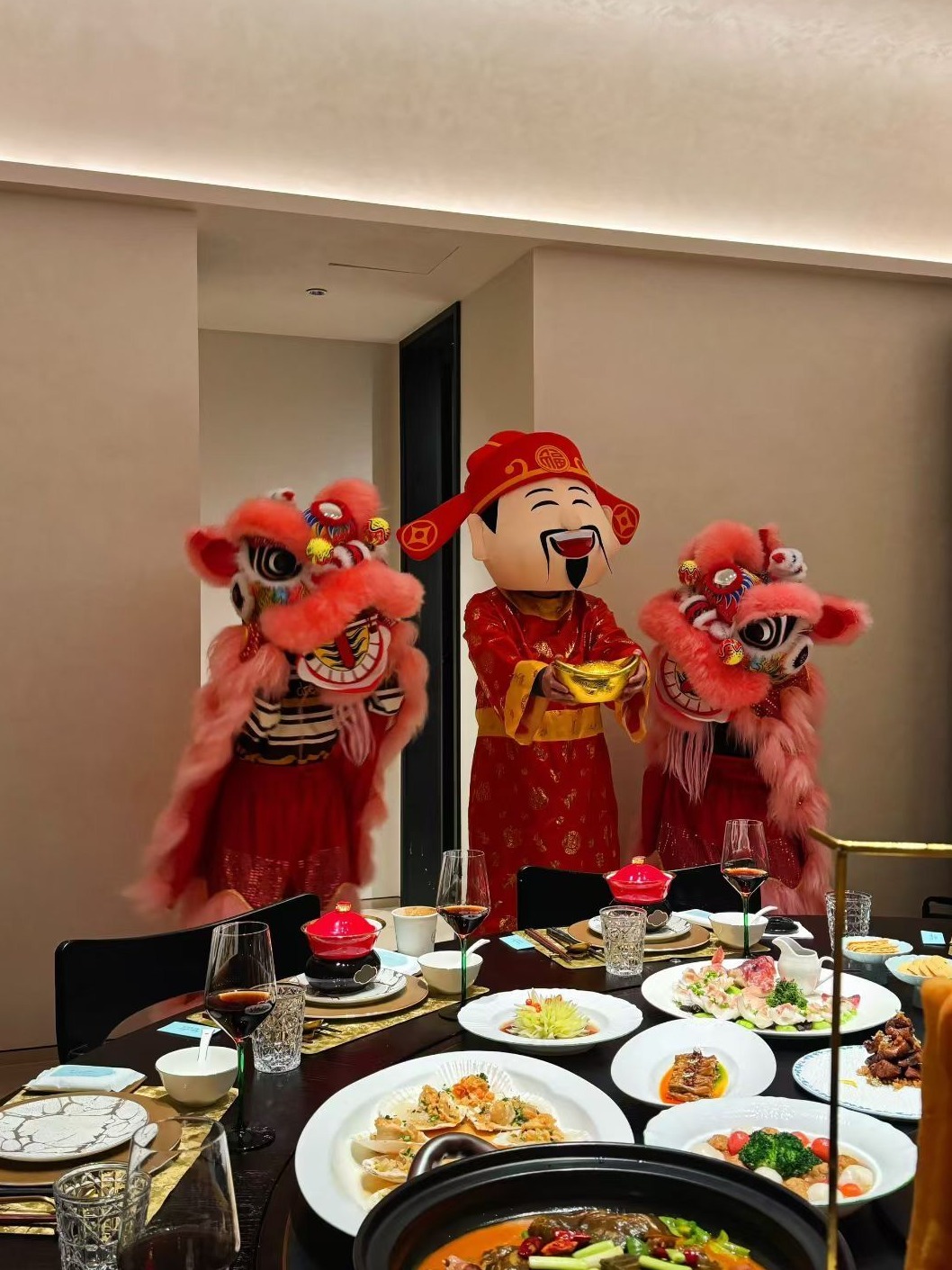 包厢内,骤然响起激昂喜庆的敲锣打鼓声,身着红袍、手持金元宝的“财神爷”拱手作揖,两只活灵活现的醒狮紧随其后,摇头摆尾、憨态可掬又不失威风。食客们纷纷停下手中动作,脸上满是惊喜与欢悦。“这氛围太棒了,感觉年味一下子就浓到心里去了!”市民王先生兴奋地表示。