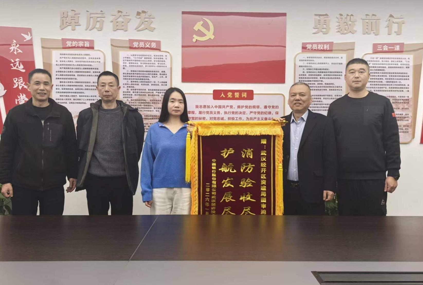 2026年2月24日,中国银行股份有限公司武汉经济技术开发区支行代表为武汉经济技术开发区自然资源和城乡建设局图审消防科赠送“消防验收尽职,护航发展尽责”的锦旗,以表达对该科室在中国银行股份有限公司武汉经济技术开发区支行备案验收过程中提供的高效、精准、贴心服务衷心感谢。