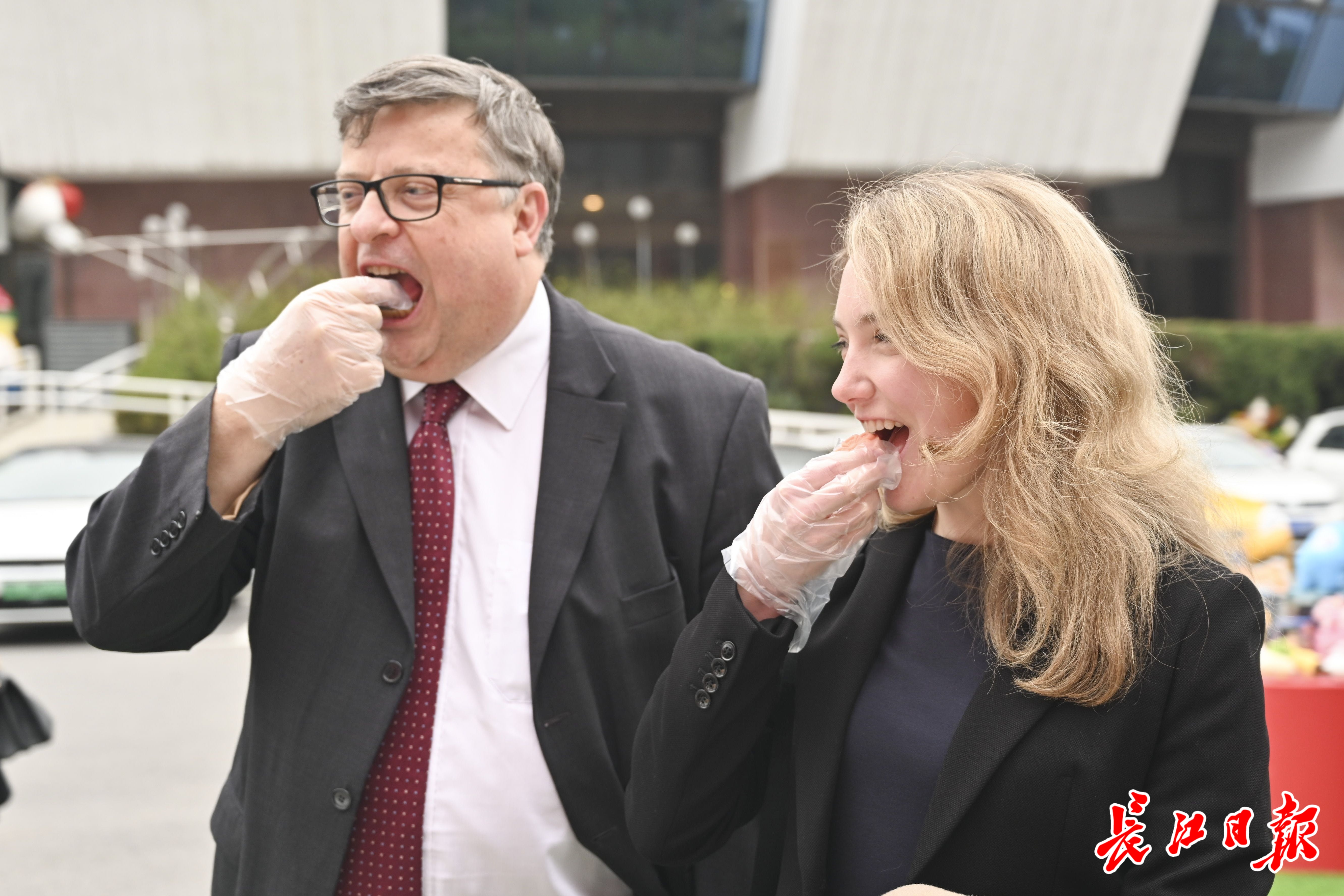 英国驻武汉总领事麦多明(左)品尝炸肉丸。夏俊俊 摄
