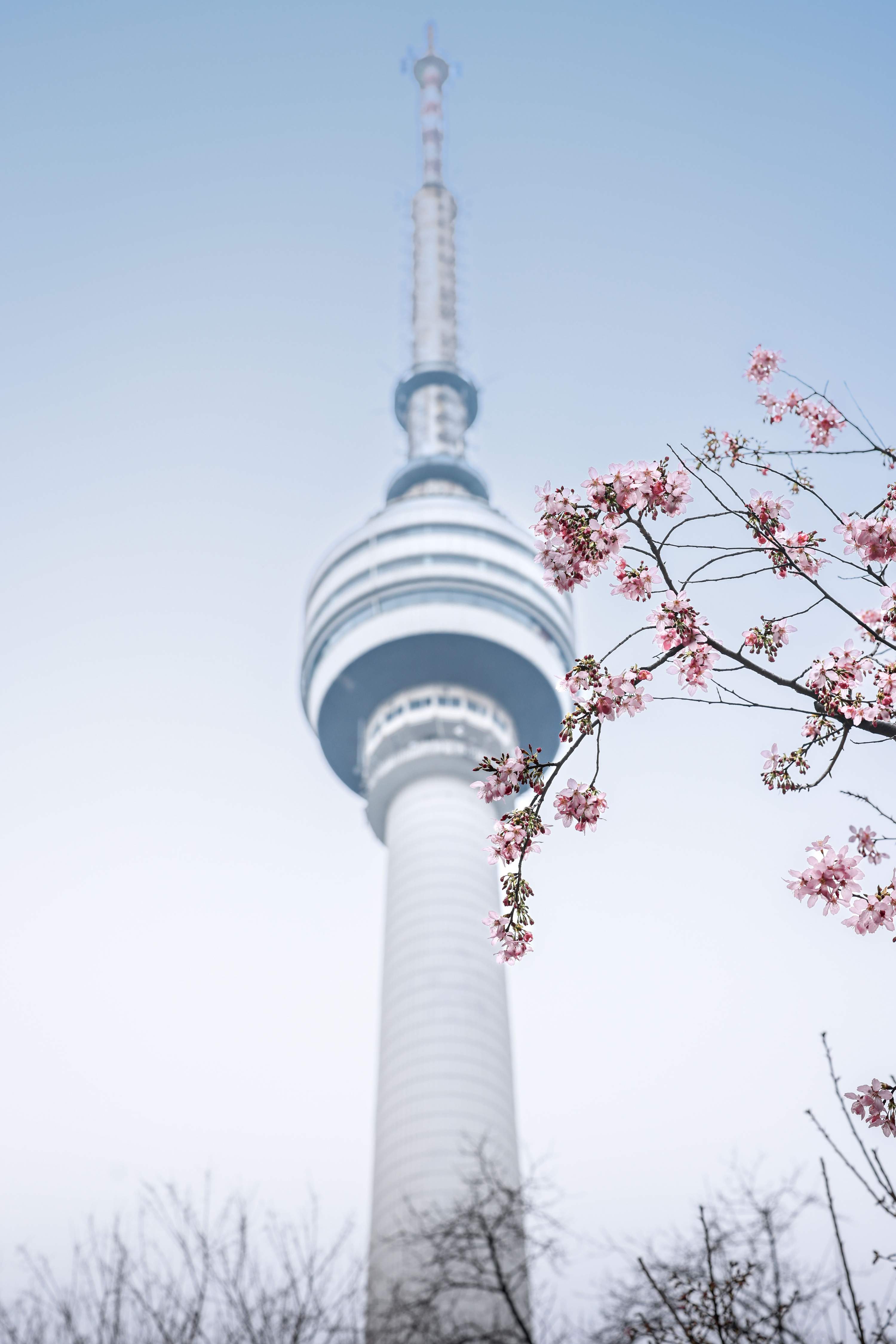 绽放的樱花与龟山电视塔同框。 刘雍涛 摄
