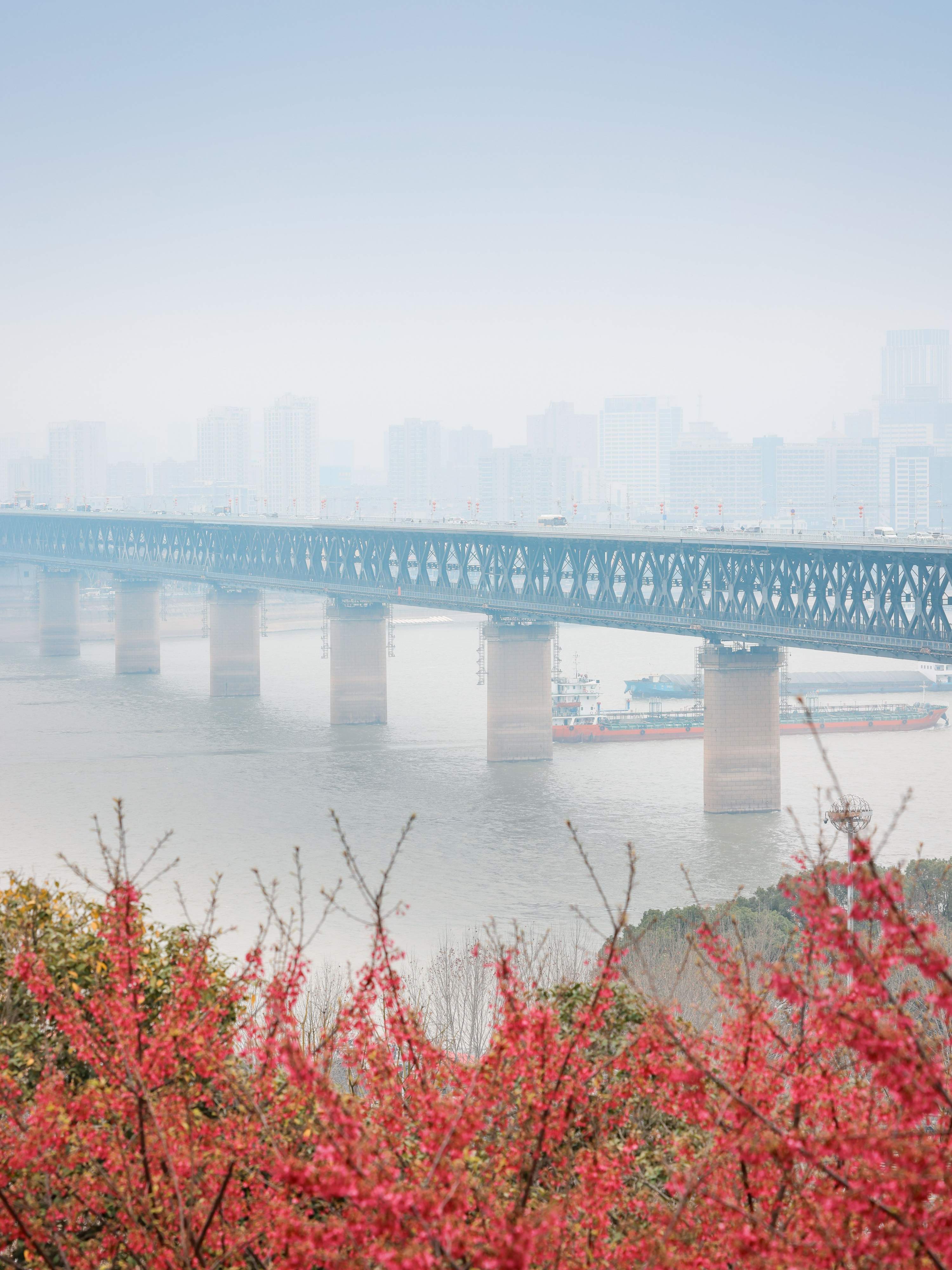 樱花栈道依山而建,拾级而上,市民游客既能近赏繁花似锦,也能远眺黄鹤楼、长江大桥等城市地标。樱花与江景、龟山电视塔同框,构成江城独一份的赏樱体验。