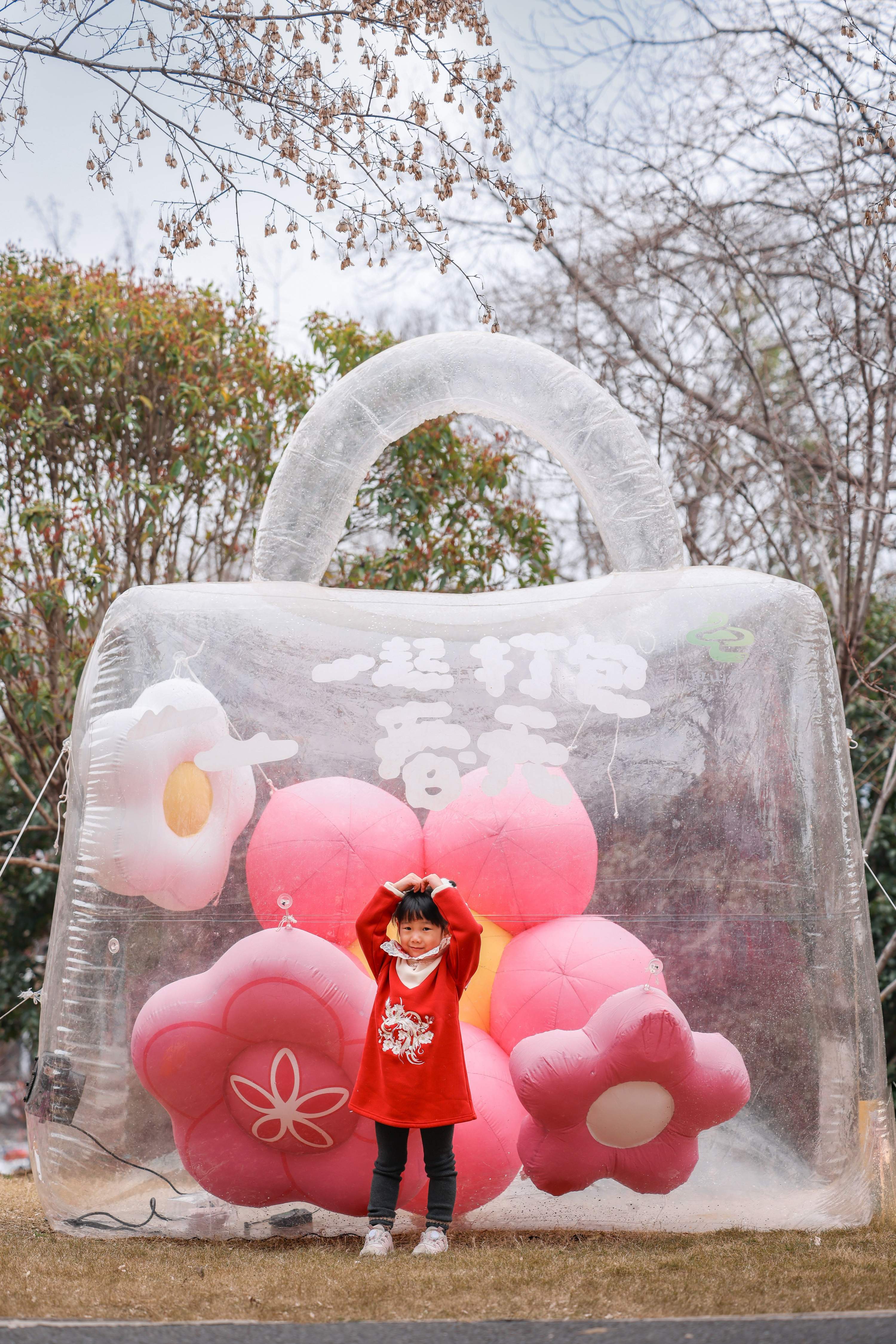小朋友在樱花气模前打卡。 刘雍涛 摄