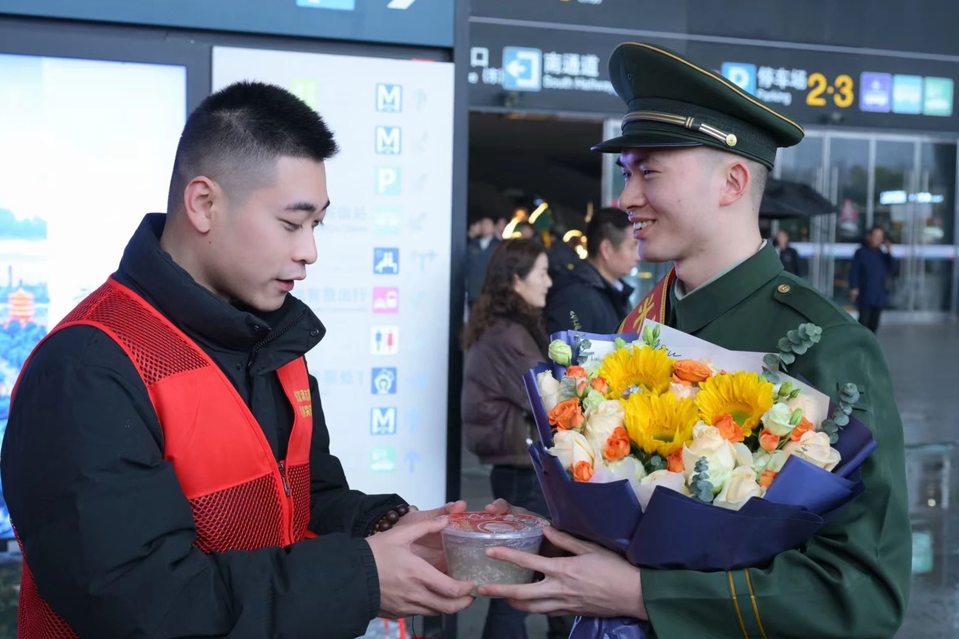长江日报大武汉客户端3月3日讯 “同志你辛苦了,欢迎回到武汉!”3月3日,武汉“三站一场”(武汉火车站、汉口火车站、武昌火车站和武汉天河机场)设立的“幸福兵站”洋溢着热烈而尊崇的氛围。返乡退役军人一出站,就收到工作人员递来的鲜花、绶带。正逢元宵节,工作人员还准备了热气腾腾的汤圆,让返乡的退役军人们感受到家乡人民的问候与关心。