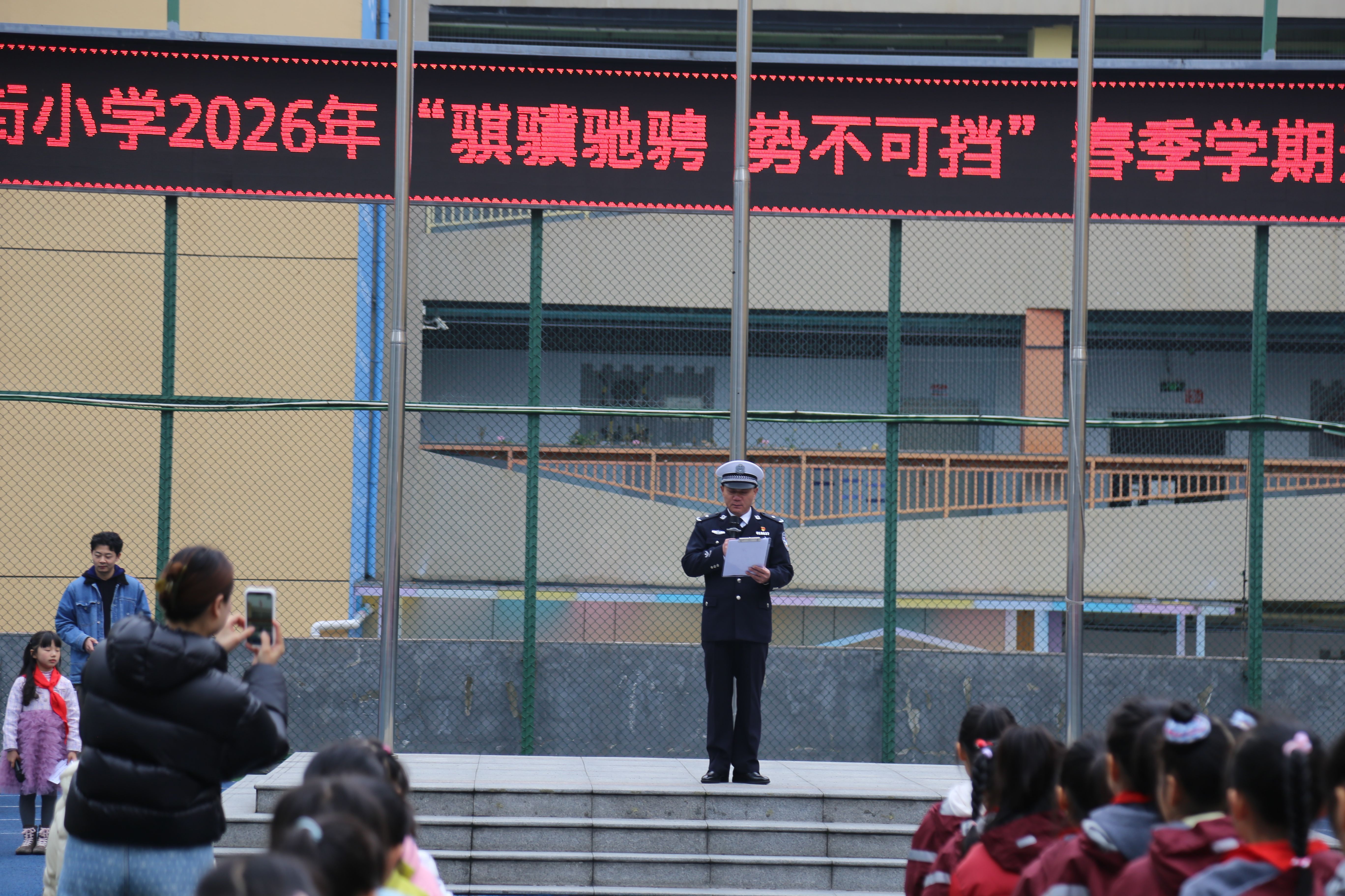 3月4日上午,武昌区白鹭街小学举行2026年春季开学典礼。校园内操场上,全国公安系统二级英模、武昌区交通管理大队民警刘五桥以“守规则守平安 做担当好少年”为主题,给该校全体师生讲了交通安全“开学第一课”。