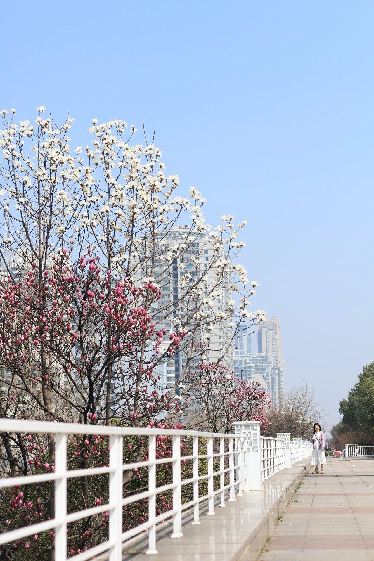 汉口江滩长春门至永清门,花多人少的玉兰花长廊别错过。在樱园旁边,洁白的玉兰缀满枝头,与早樱相映成趣。汉口江滩戗台上的玉兰也在逐步开放,春日的进度条正在慢慢加载中。