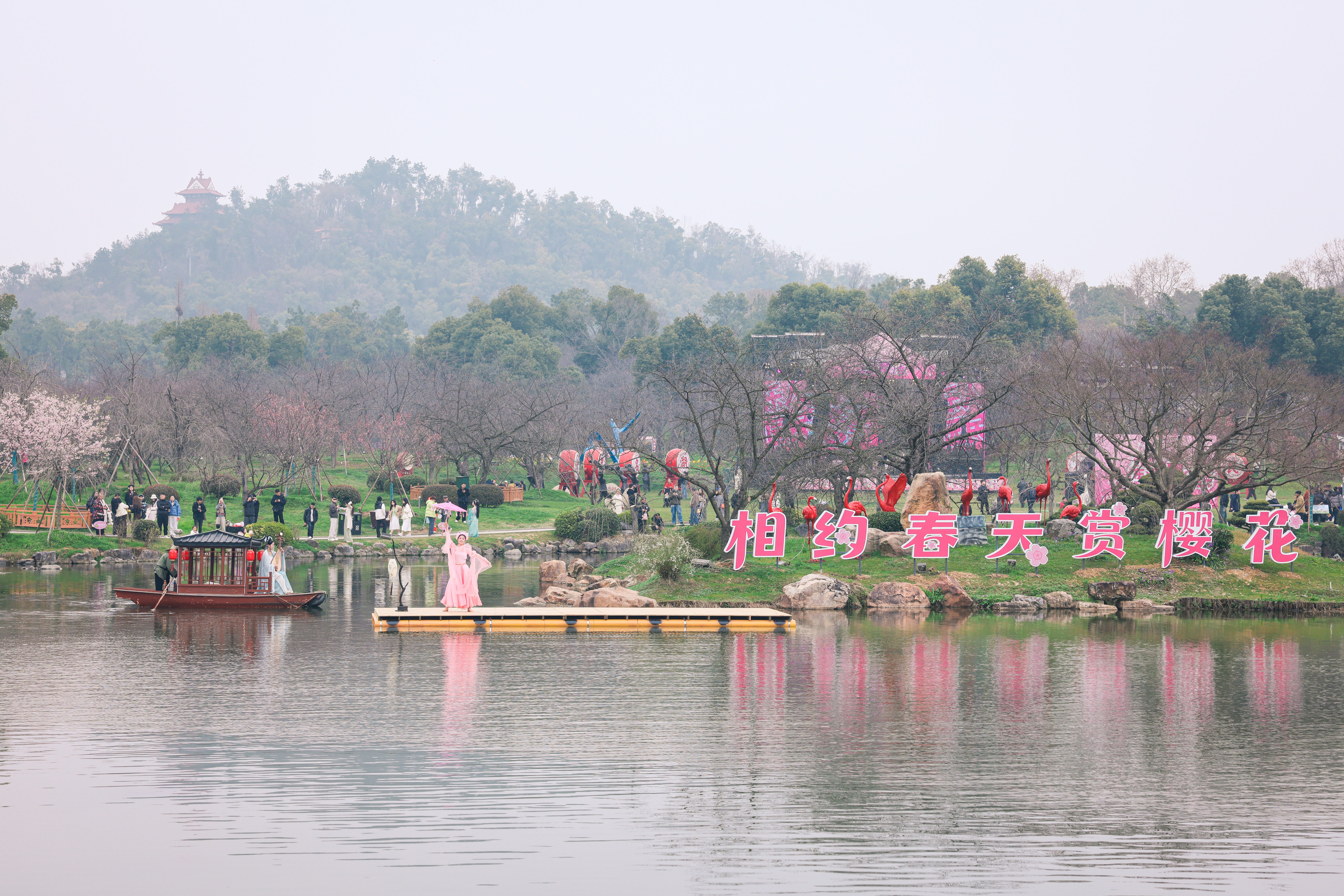 湖心岛、曲院樱艳等点位,国风歌舞表演轮番上演,演员们身着楚风服饰,舞步轻盈,搭配着琵琶等传统乐器的现场演奏,熟悉的旋律在花海间回荡,瞬间将游客带入浓郁的楚文化氛围中。