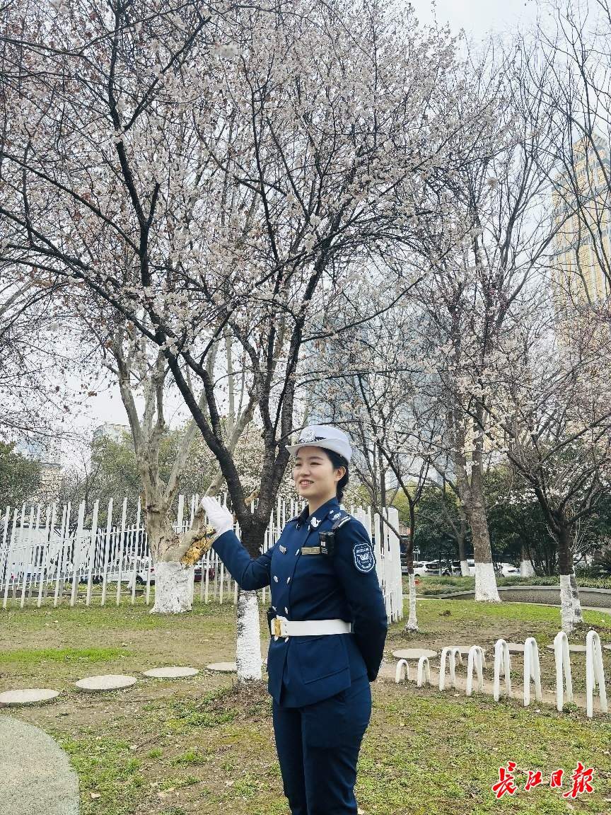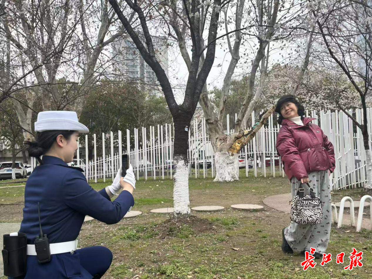 3月4日,汉口江滩樱花园早樱初绽,粉白的花瓣在江风中轻轻摇曳。游客周女士对身穿制服、正在巡逻的郑吾伊说,“能帮我拍张照片吗?”郑吾伊微笑着接过手机,定格下周女士与樱花的春日合影。