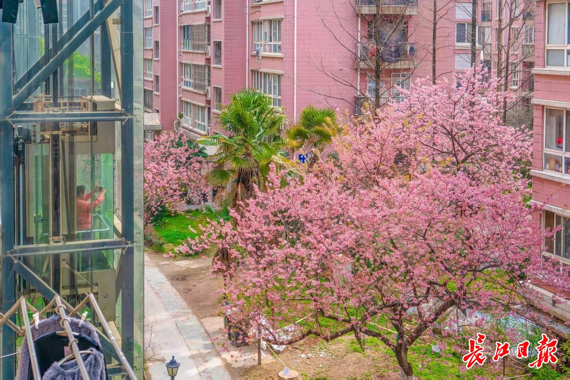 小区加装的透明电梯,成为独特的“空中观樱台”