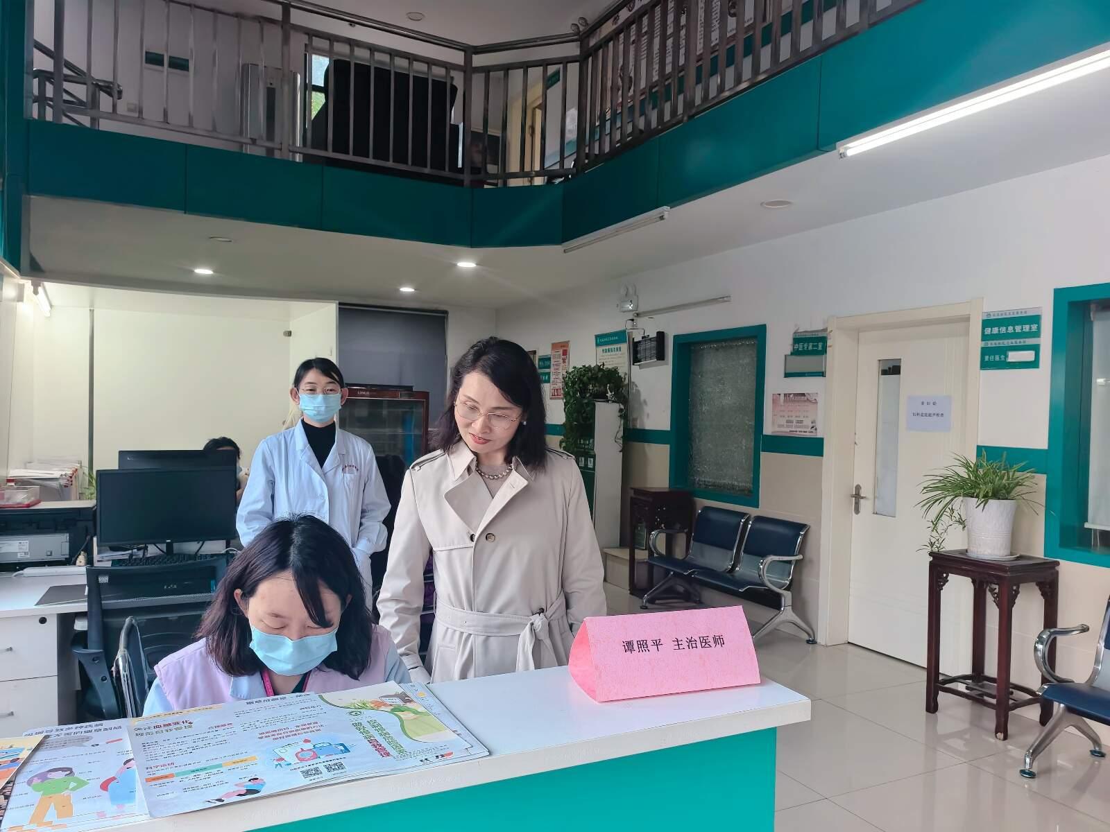 门诊办主任赵晓明与谭照平医生一同在现场为居民提供健康咨询与便民服务。