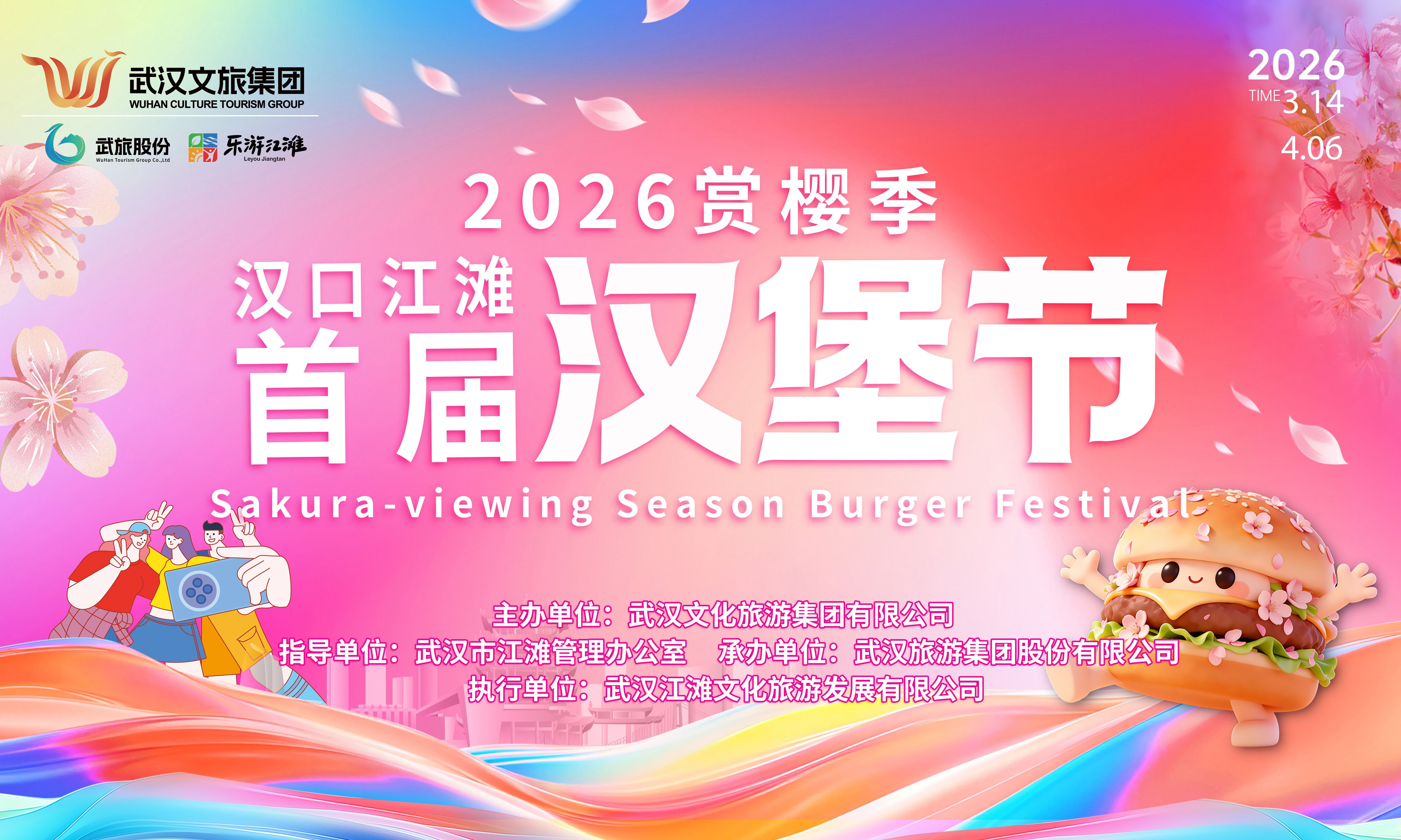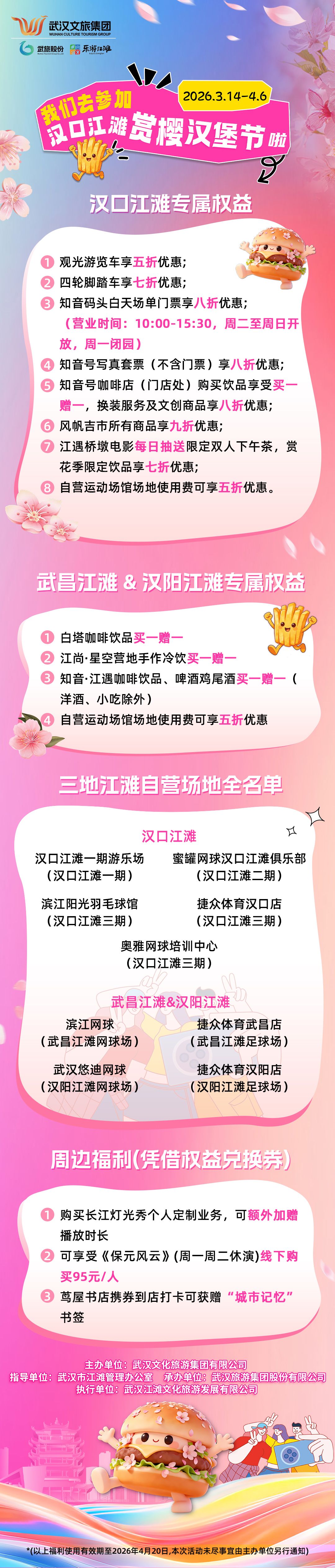此次活动由武汉文化旅游集团有限公司主办,武汉市江滩管理办公室指导,武汉旅游集团股份有限公司承办,武汉江滩文化旅游发展有限公司执行,旨在为市民游客打造一个集美食、美景与丰富文旅福利于一体的春日滨水休闲新地标。