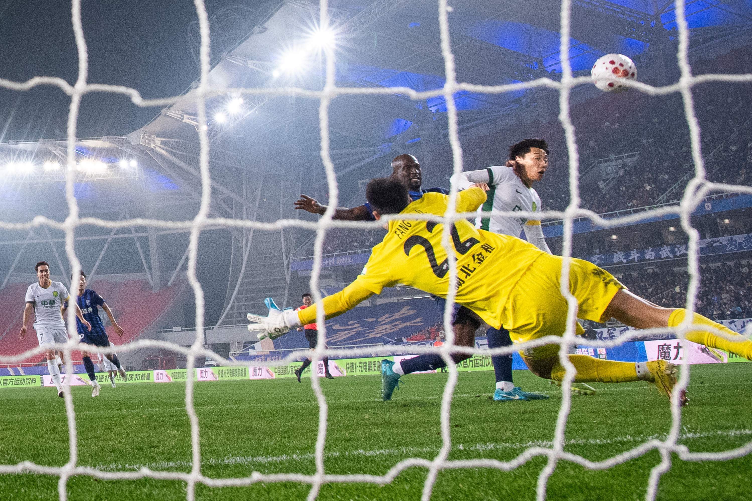 武汉三镇队守门员方镜淇在比赛中扑救。新华社发