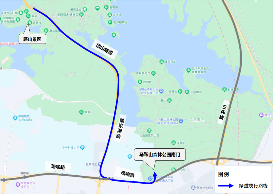 二、磨山景区:从鲁磨路、团山路进入绿道的车辆可绕行团山隧道从喻家湖路到珞喻路森林公园南门进入绿道。