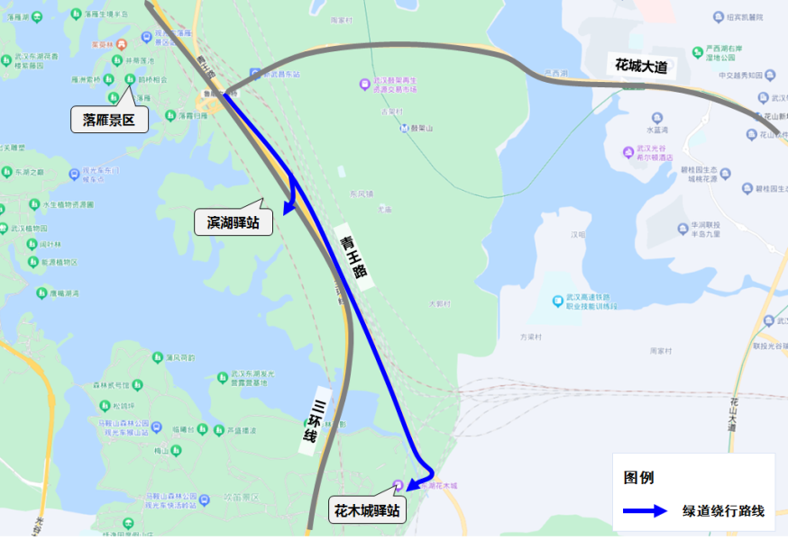 三、落雁景区进入绿道的车辆可以绕行青王路花木城驿站和滨湖驿站进入绿道。相对梨园和磨山两个主入口,其他绿道入口车位充足,人流车流相对较少。