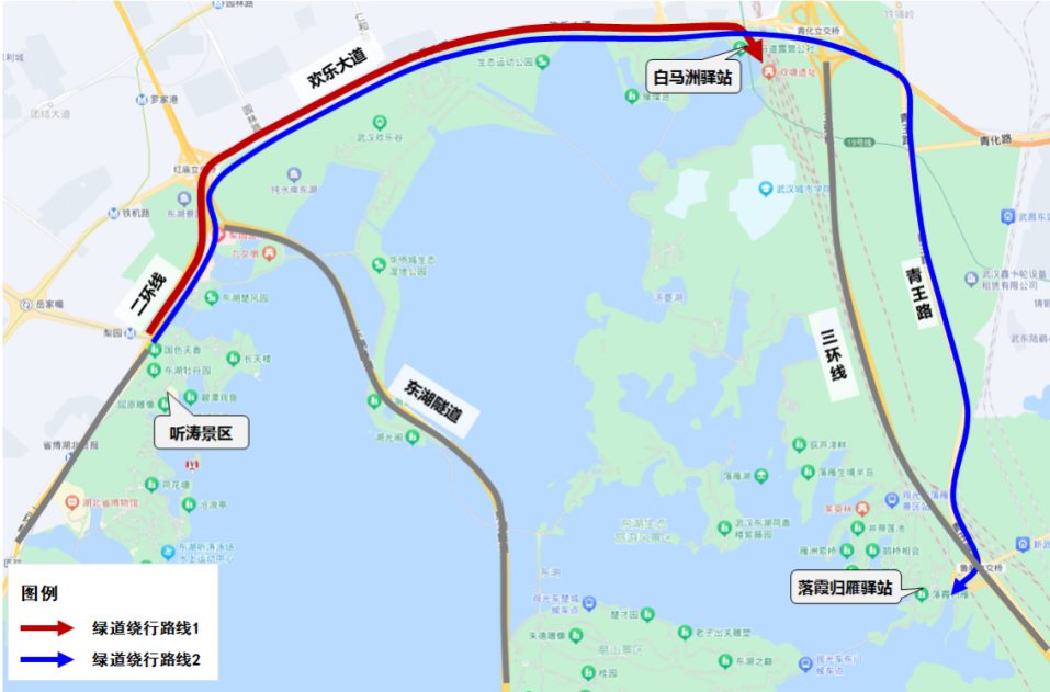 一、听涛景区:从楚风园停车场进入绿道的车辆如遇拥堵,可绕行欢乐大道从白马州驿站进入,也可继续走青王路从落霞归雁驿站进入绿道。