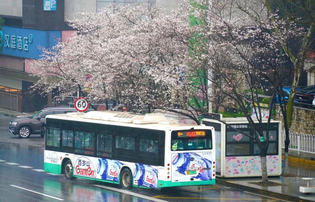 3月17日,在珞喻东路大黄村公交车站看到,站台周围的樱花刚刚绽放,乘客抬头就可看到雨中绽放的樱花。详见>>>